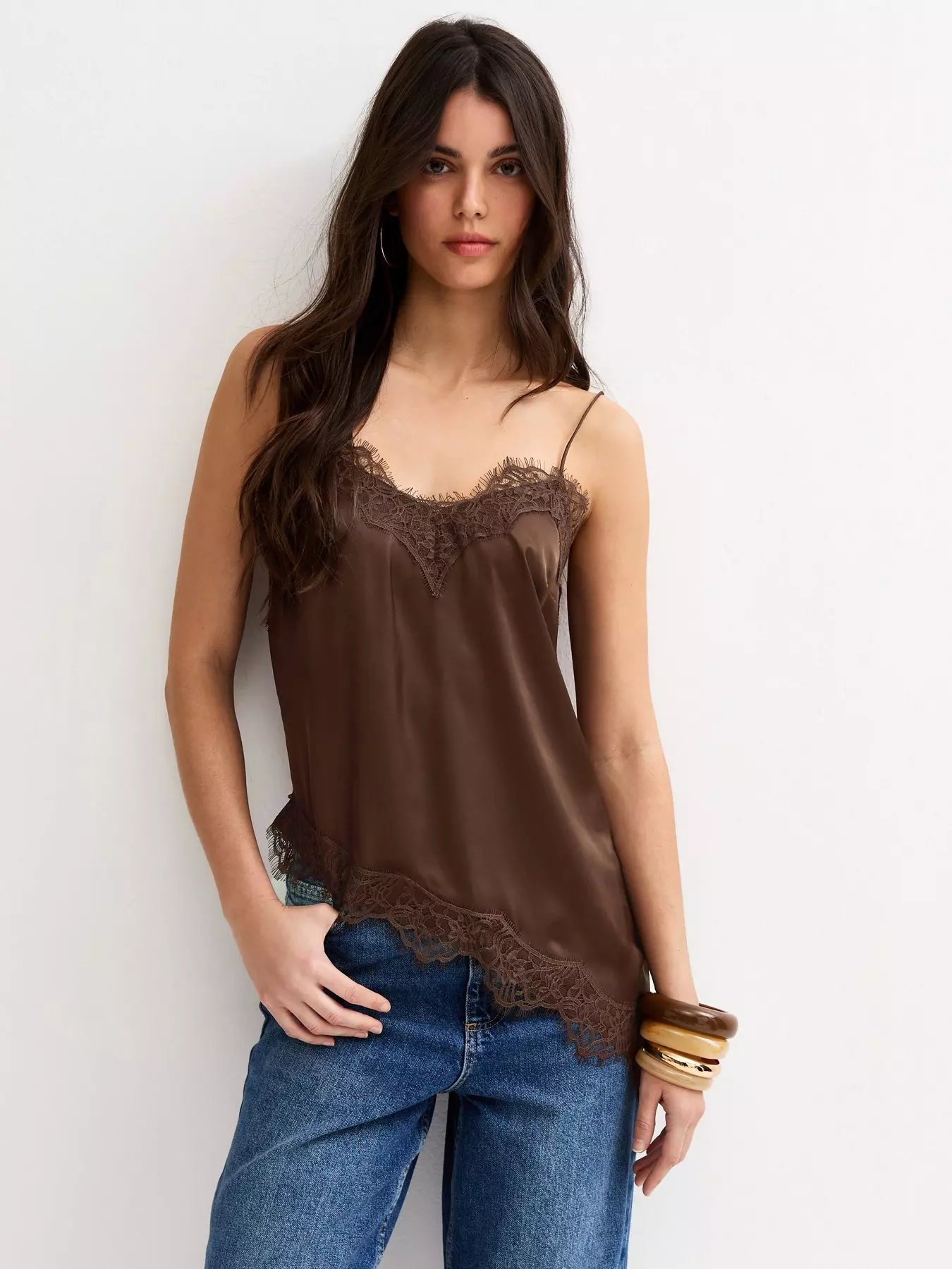 New Look Dark Brown Satin Asymmetric Lace Hem Cami Top