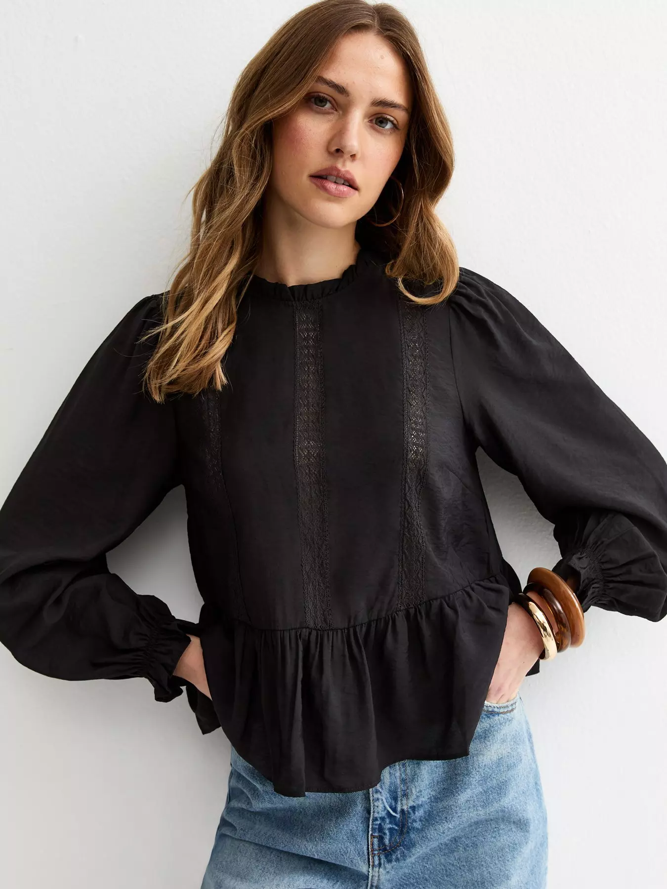 New LookLace Insert Frill Neck Blouse - Black