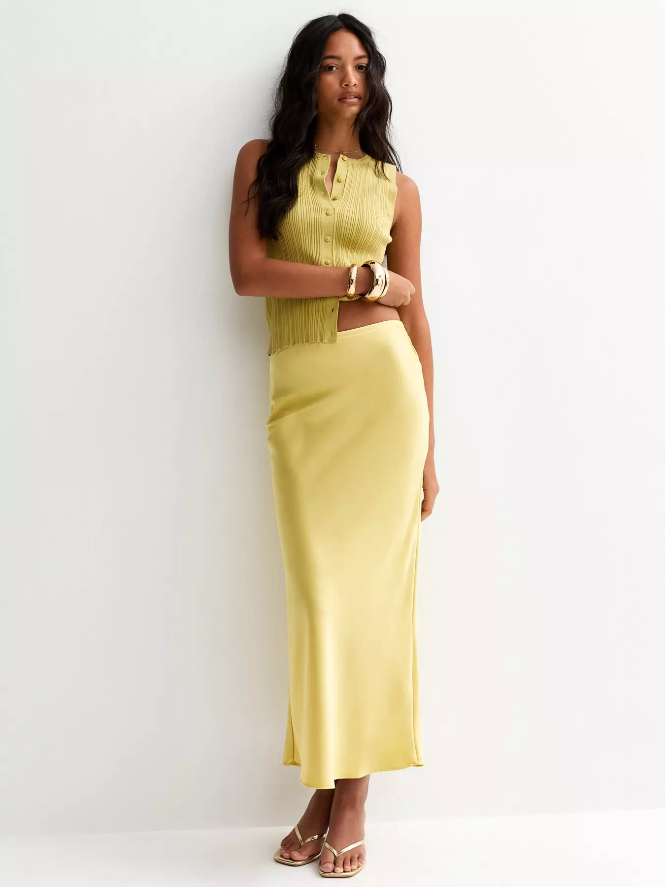 New Look Light Green Satin Bias Cut Midi Skirt