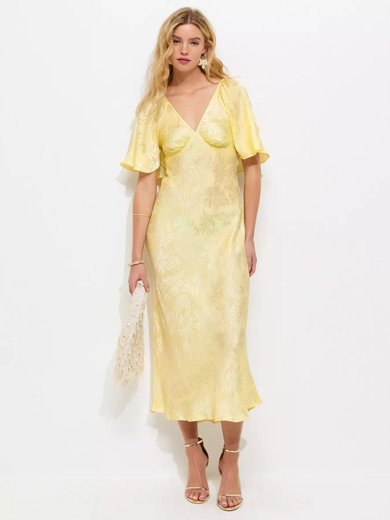 New Look Light Yellow Palm Leaf Jacquard Flutter Sleeve Midi Dress