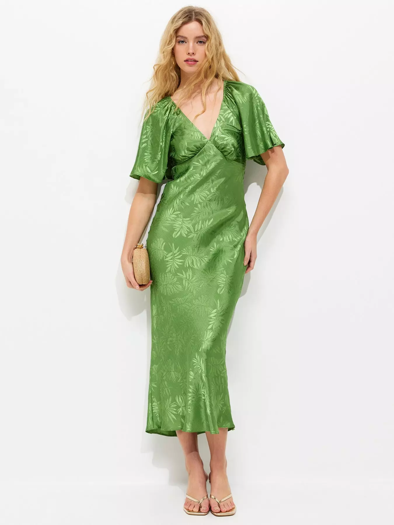 - Palm Leaf Jacquard Flutter Sleeve Midi Dress - Light Green by New Look