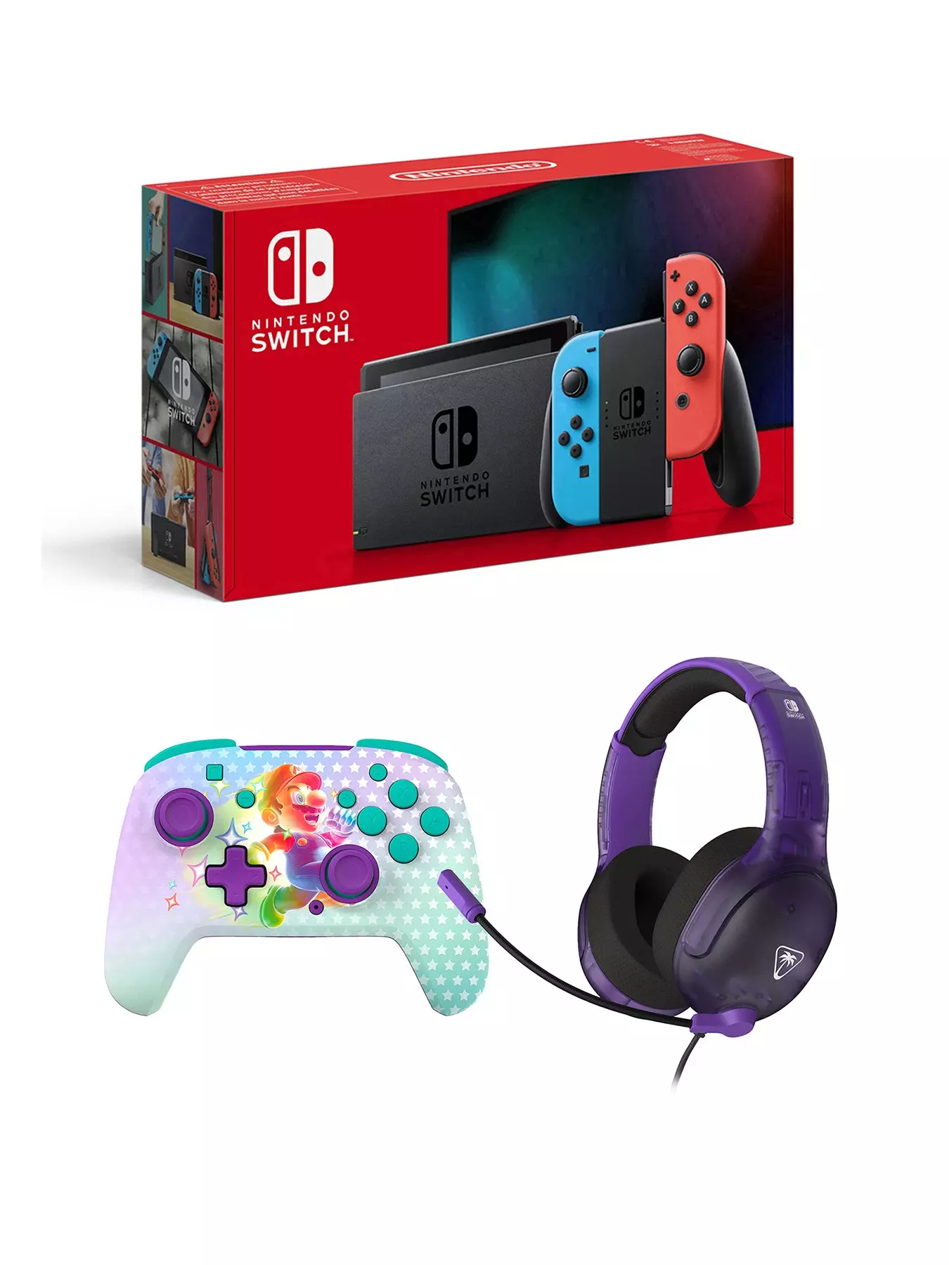 The Switch console with Rematch Wireless Controller - Invincible Mario + Airlite Fit Ghost Purple Headset