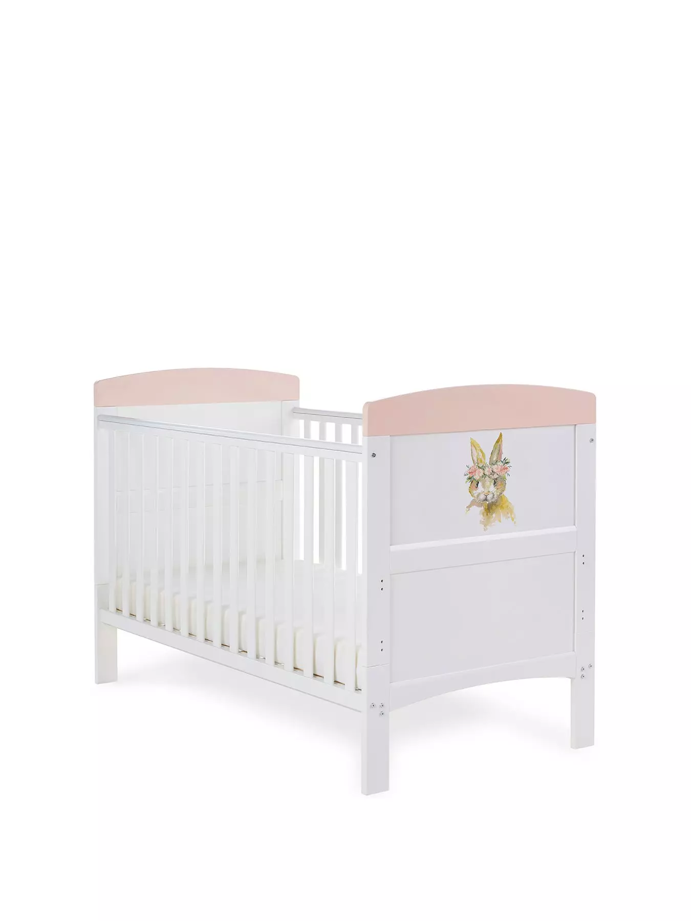The Grace Inspire Cot Bed balances style with simplicity. Both you and your little one will love the adorable rabbit design and pretty pink end tops, too.This cot features an adjustable 3-position mattress base, which can be lowered as they grow. This puts less strain on your back in the early days, and allows you to keep them safe and secure as they find their feet. The addition of teething rails helps to ensure that their delicate first teeth are protected at all times, too.