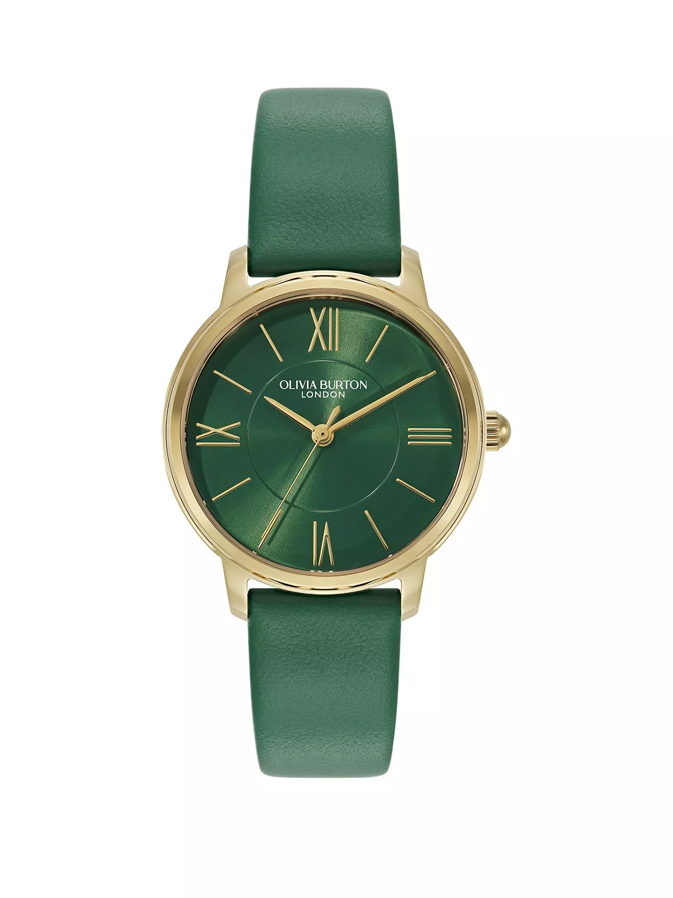 Olivia Burton 30mm gold IP watch, deep grass green sunray dial with UP roman numbers & stick index, finsihed on a deep green leather strap. Water resistant to 3 ATM.- Case Diameter (in cm): 3
