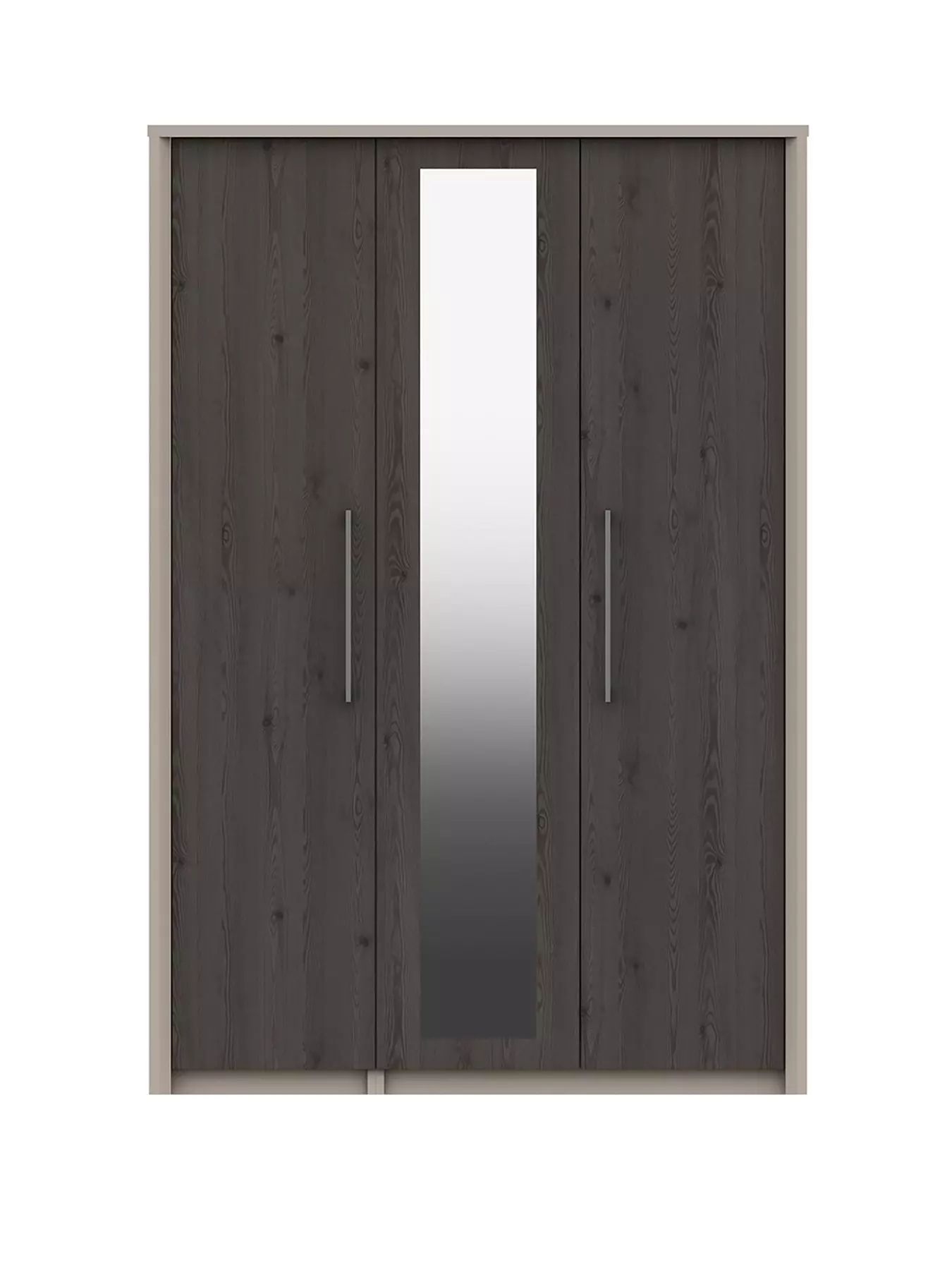 Ultra modern, this wardrobe from our UK made Smyth collection has a taupe painted look to the frame and boasts a mirrored centre door and smartly angled front edges. The taupe colour contrasts eye-catchingly with grained-effect doors that come in a choice of light grey or dark grey.