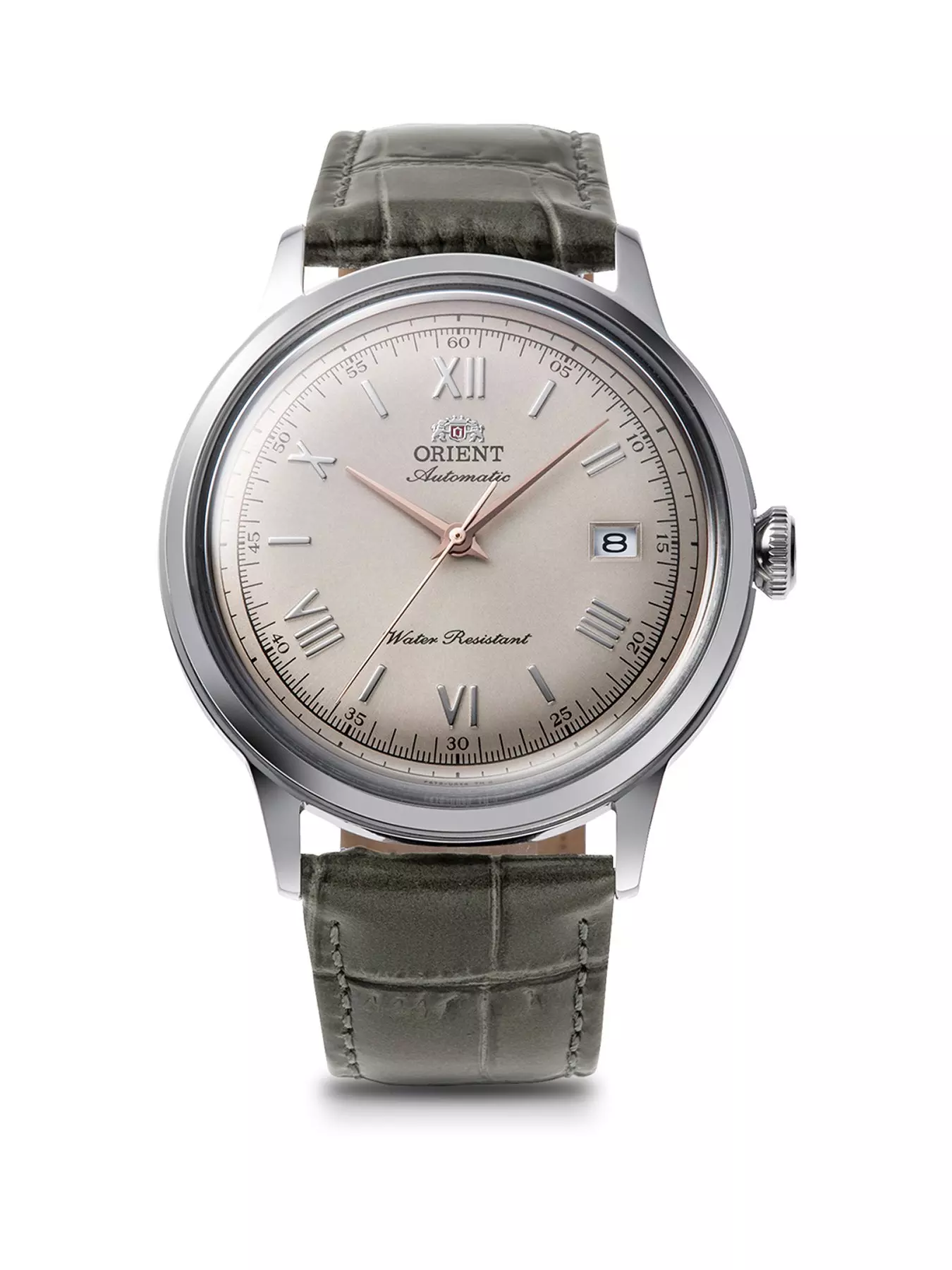 The Orient Bambino 40.5mm is a gorgeous, stylish watch with vintage styling and retro domed glass. The Bambino line has become a true classic, enjoyed by watch enthusiasts across the world. Whether you have a big collection or if you are tipping your toes in the world of mechanical watches, this watch will never look out of place and offers tremendous value for money. Under the hood is Orient's Made in Japan in-house automatic F6724 Calibre, that is also visible through the case back. The watch itself looks stunning. It goes back to the roots with a seemingly simple design, however the details magnificent. The glass is the 'piece de resistance' it is domed, which makes this watch stand out to anyone with good taste and covers a stunning grey dial with roman numerals matched only by the grey leather strap.- 24Hr Display: N