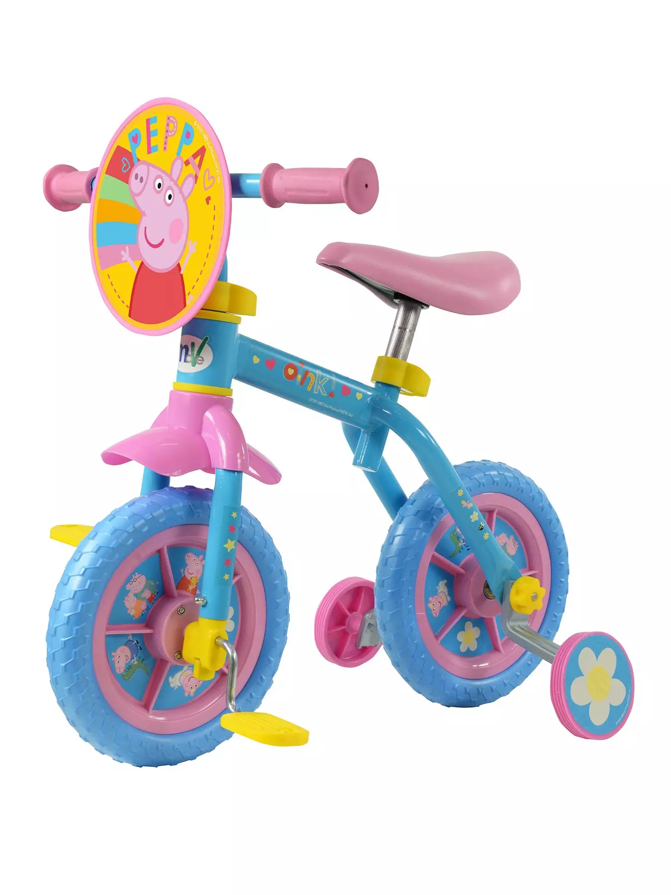 Introducing the Peppa Pig My First 2-in-1 10" Training Bike - the perfect ride for little adventurers ready to pedal into fun-filled journeys! Featuring vibrant character graphics and a shaped plaque, this bike is officially licensed with all your favourite Peppa Pig pals. But that's not all - it's also a master of versatility, seamlessly converting from a training bike to a balance bike in just minutes! With direct pedal drive and quick-release pedals and stabilizers, young riders can easily transition between stages as they build coordination and core balance. Plus, with puncture-proof tires and a front mudguard to keep things clean, every ride is smooth, stable, and mess-free. Safety comes first with its durable steel frame and EN71-tested design, ensuring peace of mind for parents. Adjustable handlebar and seat heights accommodate growing children, while soft moulded grips provide comfort for little hands. Get ready to roll with Peppa and friends on this amazing 2-in-1 training bike - it's a wheely good time for all Peppa enthusiasts!- Depth: 63 CM