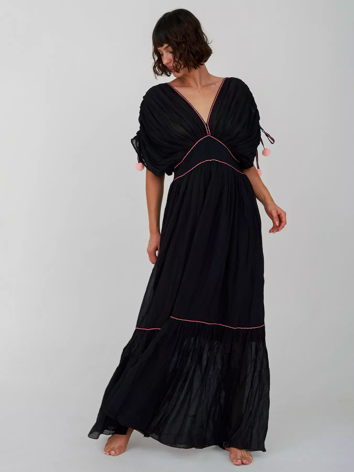 - The Clara Dress features exaggerated sleeves, is cinched at the shoulder with Inca trim detailed with pom poms, and has a cinched bodice accented with Inca trim and a wide ruffle maxi skirt. The perfect beach dress.