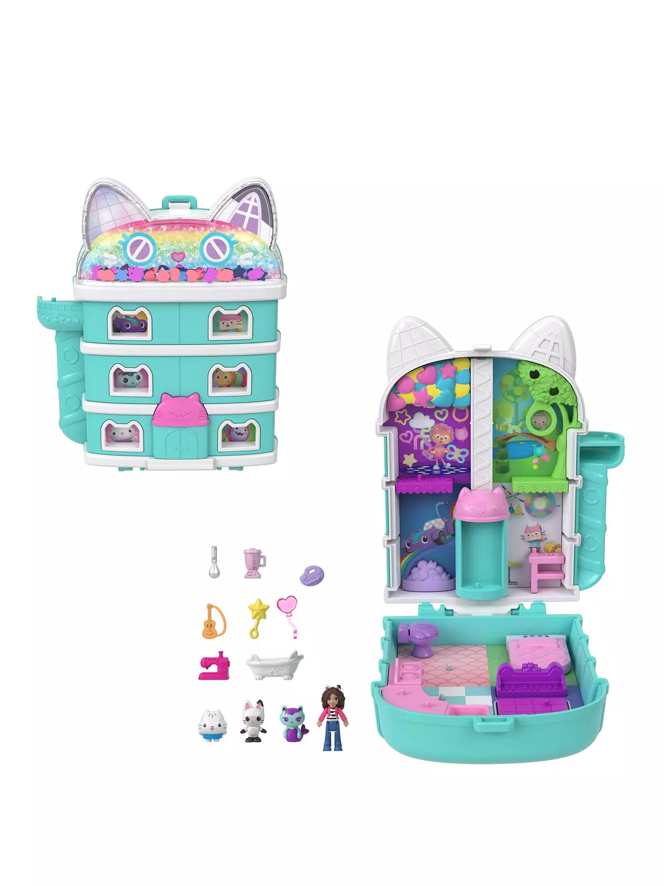 - The Gabby's Dollhouse inspired compact features a glitter shaker roof and opens to themed rooms inspired by the animated series!