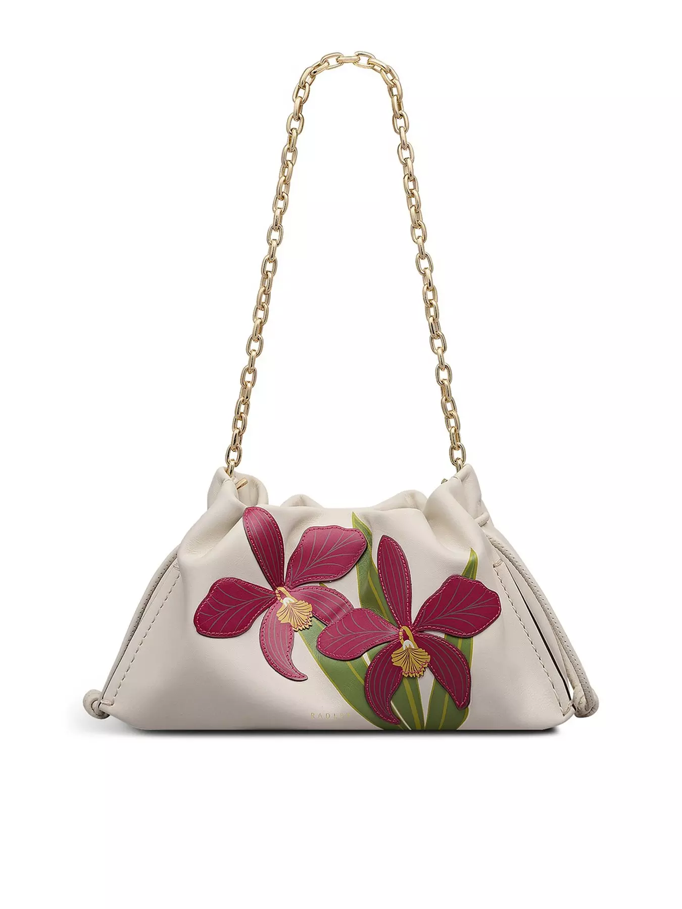 Inspired by the beautiful blooms growing in the Orchid House at RHS Garden Wisley, this handbag from our latest collaborative collection is crafted with floral leather applique and screen prints. In the shape of The Roxburgh clutch with the same drawstring fastening and detachable chain handle, this Radley x Royal Horticultural Society style is perfect for your spring/summer events.- Smooth leather