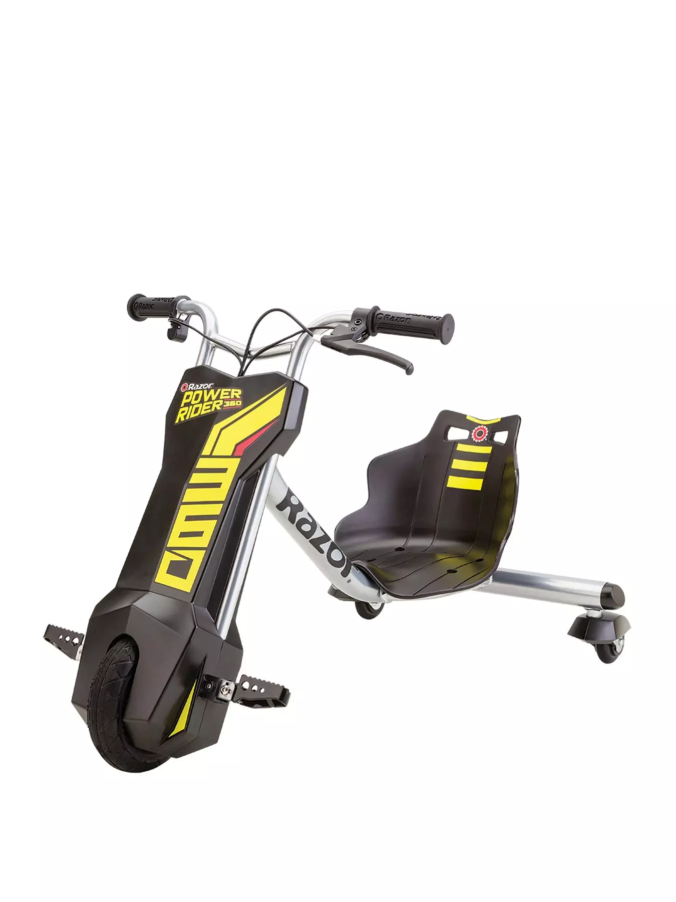 Ride into the future with the Razor PowerRider 360 electric powered 3-wheeler. Features a chain-driven motor, with push button throttle and a hand operated braking system, hi-impact pneumatic front wheel and folding foot pegs for easy entry and exit. With the push of a button, you're off - no pedalling required. Race at speeds up to 9 mph, cut full 360-degree spins, slide, even drift on PowerRider 360's high-performance duel inclined rear caster wheels. With a welded steel frame with moto-style double crown fork design create a unique look for this electric tricycle with a run time of up to 30 minutes of continuous use. Steering can help kids develop core and neck strength while seated, as well as arm extension and reach while holding the handlebars and operating the hand-powered front brake. Comes with a 12-volt rechargeable battery and charger. Dimensions: 95 x 60.2 x 61.8 cm. Weight: 12.2 kg. Suits ages 8 years +. Maximum user weight of 54 kg.- Depth: 95 CM