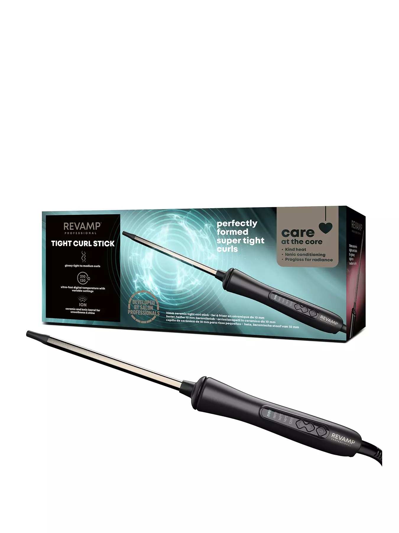 ULTRA SLIM CURLING WAND Give those curls a little extra spice. Featuring a super-slim, square-shaped 10mm ceramic barrel and create perfectly formed super-tight curls with enhanced definition or sculpted Hollywood waves with the REVAMP Ultra Slim Curling Wand. DEFINED & DETAILED CURLS Create perfectly formed curls by gently winding your hair around the wand in the direction of the desired curl-release away for an ultra-defined look. PRO TIP: Want that Hollywood wave look? Use a wide-tooth comb after curling and finish with hair serum for waves worthy of an A-list movie star. PROGLOSS SUPER SMOOTH OILS To ensure your hair is full of lustre and life, all products in the REVAMP haircare range are infused with our signature Progloss Super Smooth Oils, including Keratin, Argan, and Coconut oil. This unique combination nourishes the hair for visibly smooth results with enhanced shine. CUSTOM TEMPERATURE SETTINGS Variable, adjustable temperature settings between 120????C-210????C means you can select the temperature that is right for your hair. The Pro PTC heater ensures that the ceramic barrel heat up in seconds and that the heat is distributed evenly and quickly throughout the curling wand. EASY TO USE With a sleek, lightweight design, a built-in stand and a 3m salon-swivel cable, your REVAMP Ultra Slim Curling Wand is designed for easy styling and flexibility. For extra peace of mind, this curling wand will automatically shut off after 60 minutes without use. Heat-resistant glove included.- Accessory List: Heat Resistant Glove