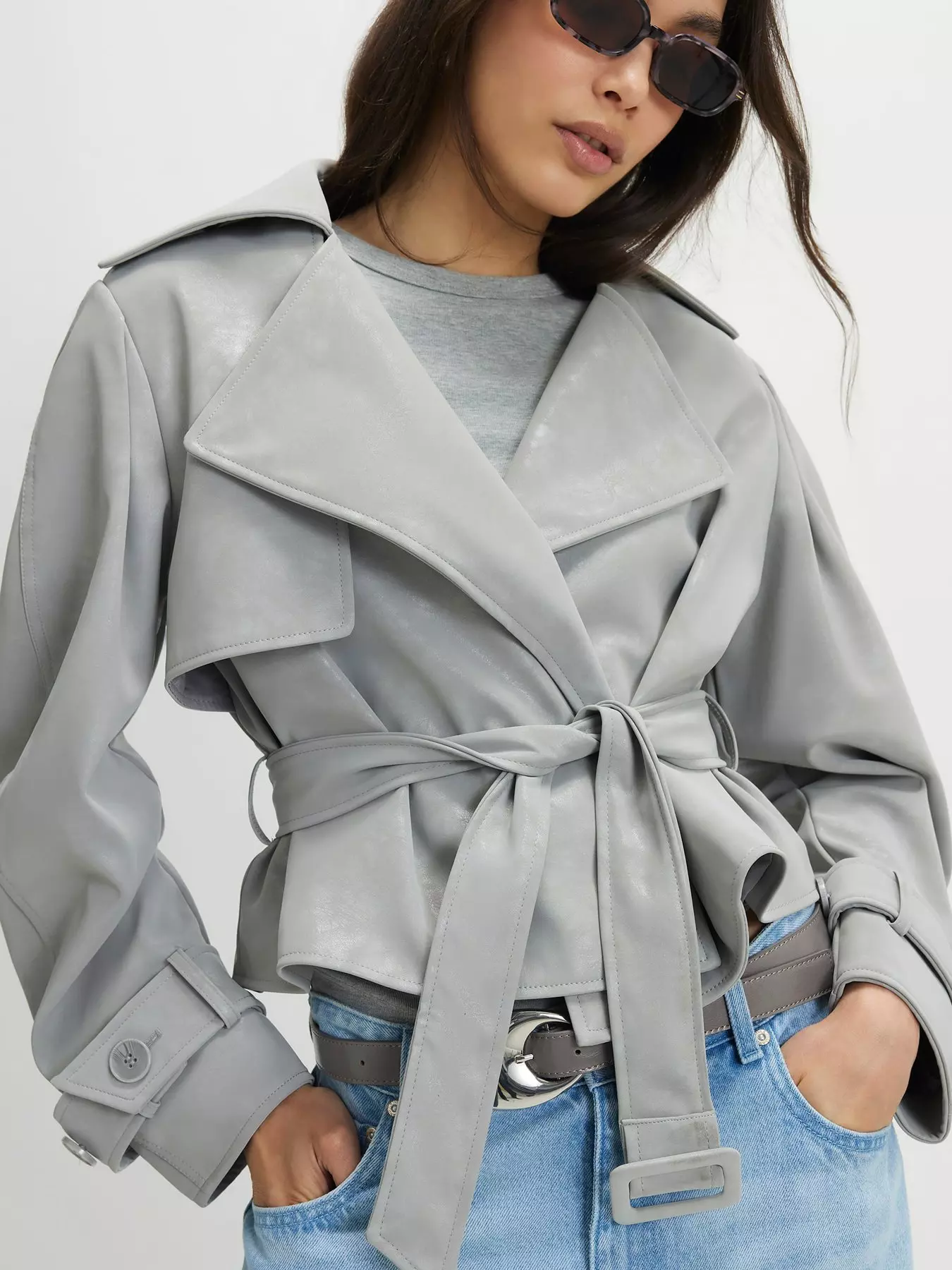 Faux leather,Collared,Long sleeves,Cropped length,Belted- Faux leather