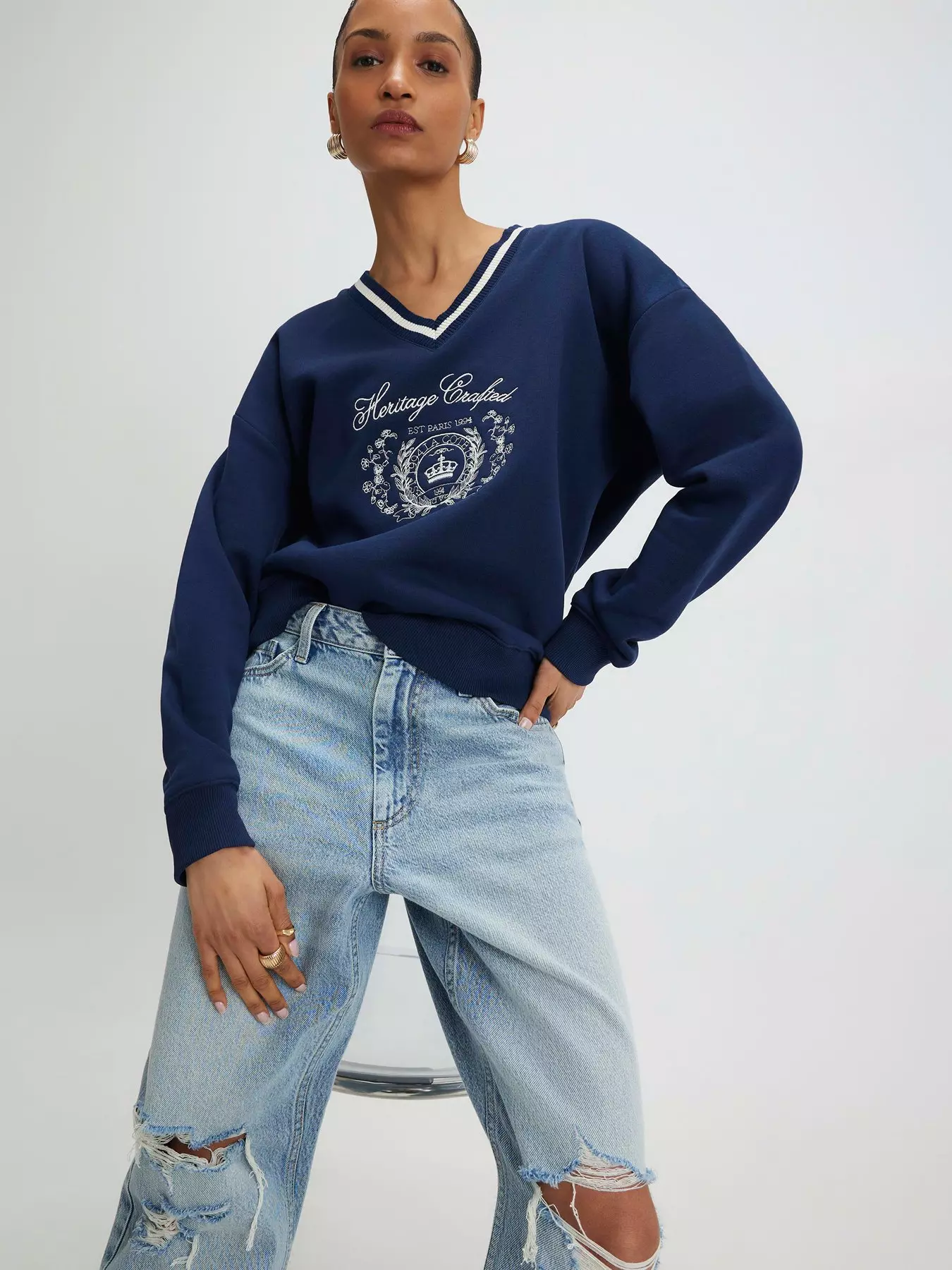 V-neck,Long sleeves,Crest embroidery,Loose fit- V-neck