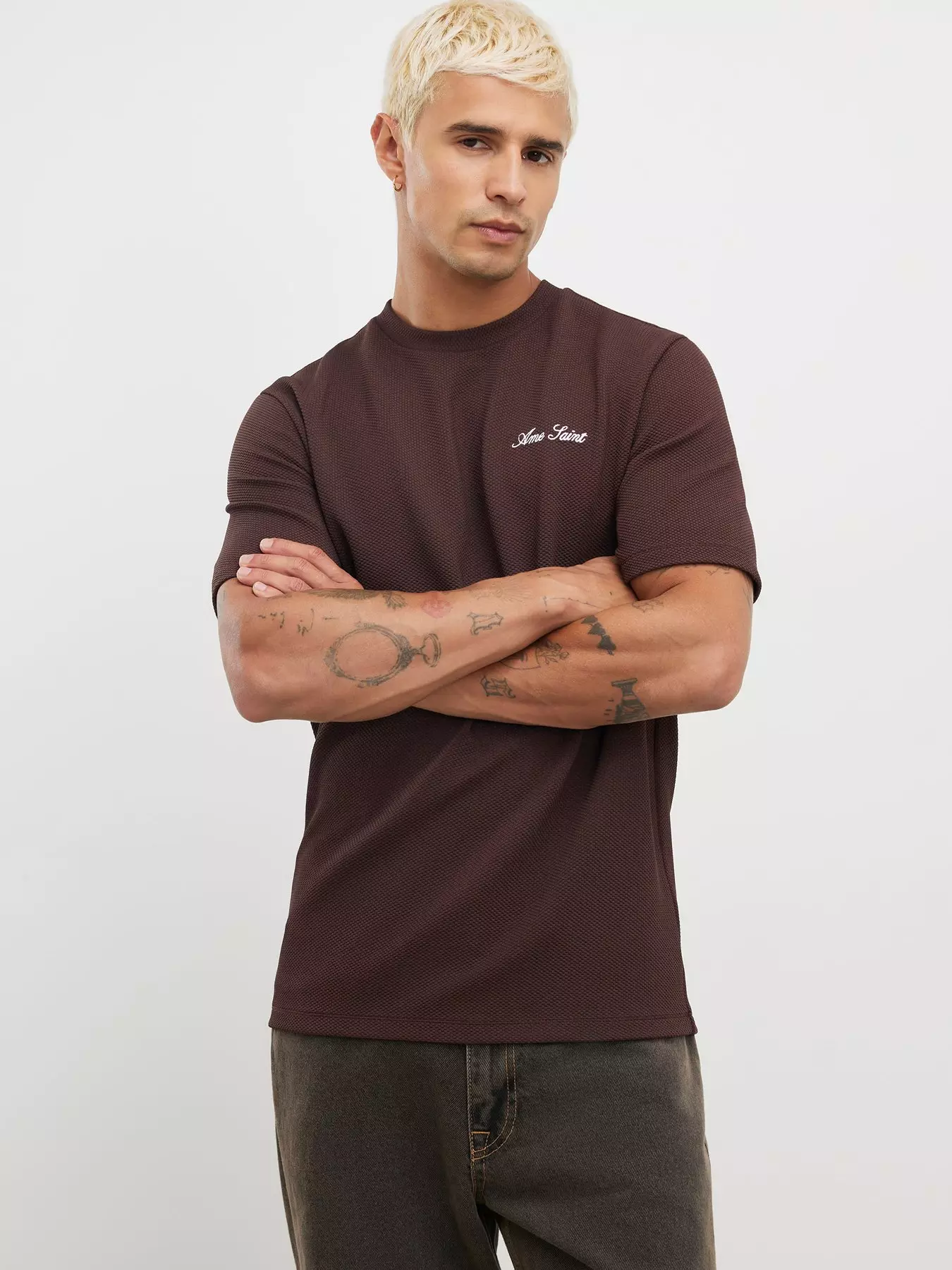 Crew neckline,Slim fit,Short sleeve,Slinky fit,Ame Saint embroidery detail,Textured fabric- Crew neckline