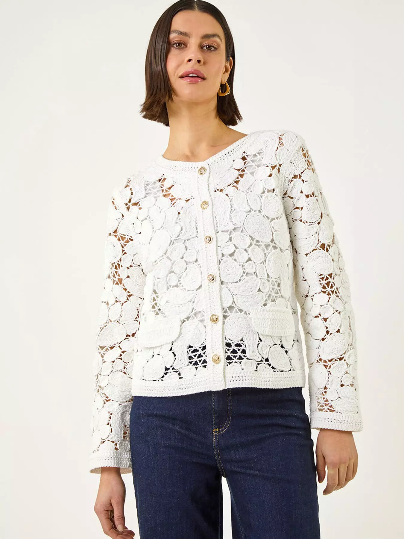 Add a touch of bohemian charm to your Spring/Summer wardrobe with this stylish crochet knit jacket. Boasting a classic button front design round neckline and elegant long sleeves this jacket is the perfect lightweight layer for the warmer months. Pair it effortlessly with a chic cami top and jeans for a relaxed yet fashionable look that is perfect for any casual outing.- Additions: Length Approx. 53cm