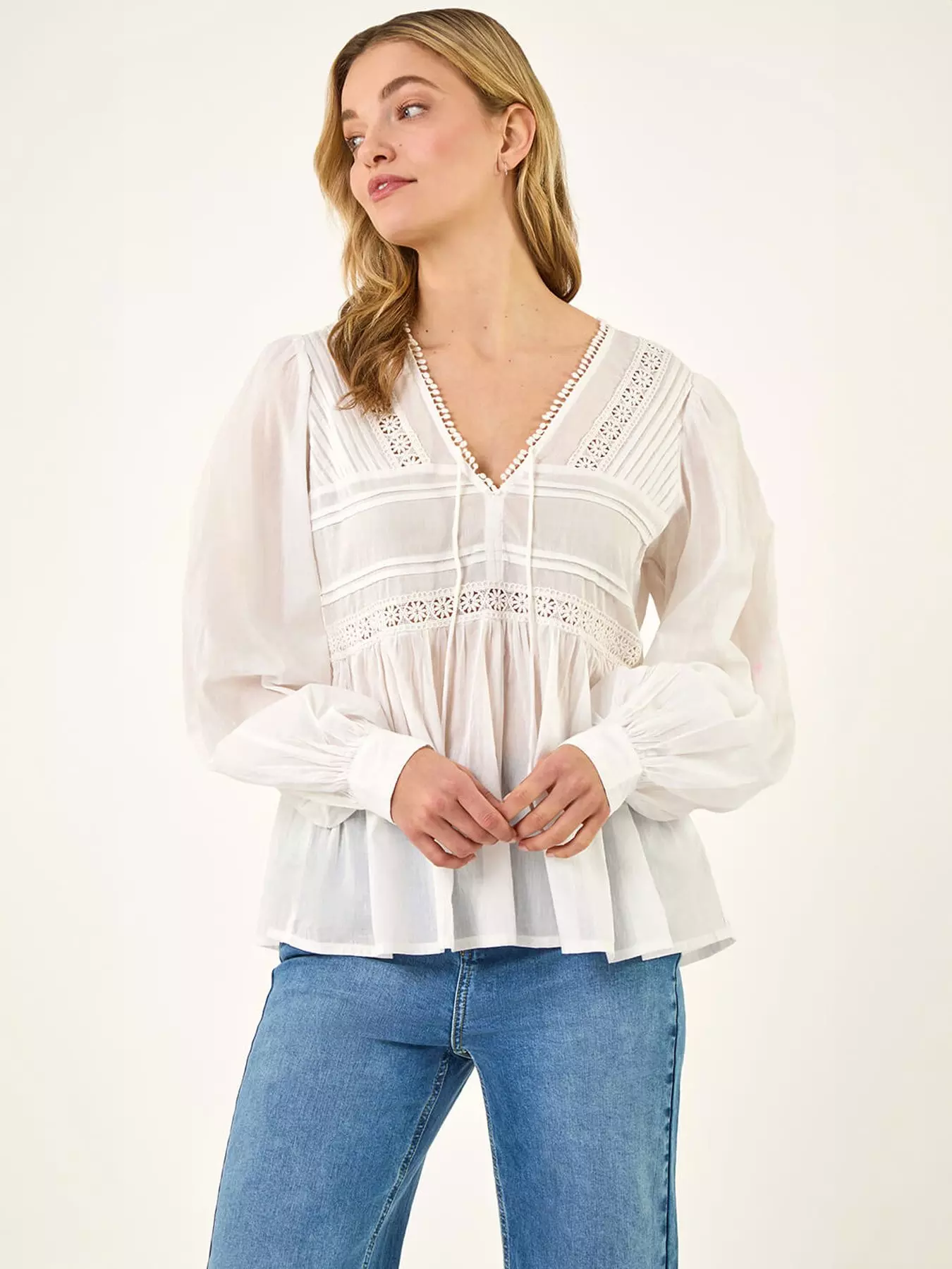 Add a delicate touch to your Spring Summer wardrobe with this Dusk lace pintuck top. Adorned with intricate ladder trims this top has a soft cotton feel that is perfect for those warmer days. The tie front detail adds a touch of charm. Style effortlessly with a denim jacket and jeggings for a complete and stylish outfit!- Material Content: 100% Cotton Lace: 100% Cotton
