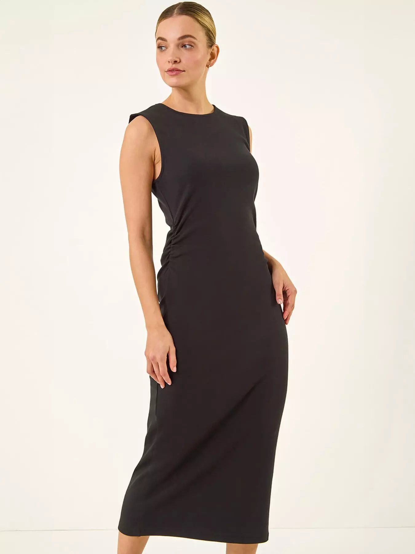 Elevate your Spring/Summer wardrobe with this effortlessly chic gathered waist midi dress. Crafted from soft and stretchy fabric this sleeveless dress features a round neck and a flattering fitted shape that accentuates your silhouette. The plain design is elevated with intricate gathered details that add a touch of sophistication. Perfect for any day or night outing style this midi dress with boots and a denim jacket for a trendy and versatile look!- Additions: Length: Approx. 124cm