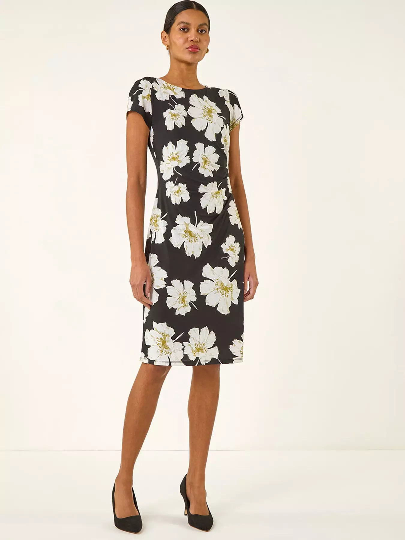 Embrace the beauty of Spring/Summer in this charming floral gather dress. Adorned with a delightful floral print this shift dress features flattering gathered detail at the waist creating a defined silhouette. Designed with a classic round neck and sweet short cap sleeves this midi-length dress is perfect for any occasion. Complete your look with a pair of stylish sandals and a classic denim jacket for a trendy and effortless ensemble!- Material Content: 95% Polyester 5% Elastane Lining: 100% Polyester