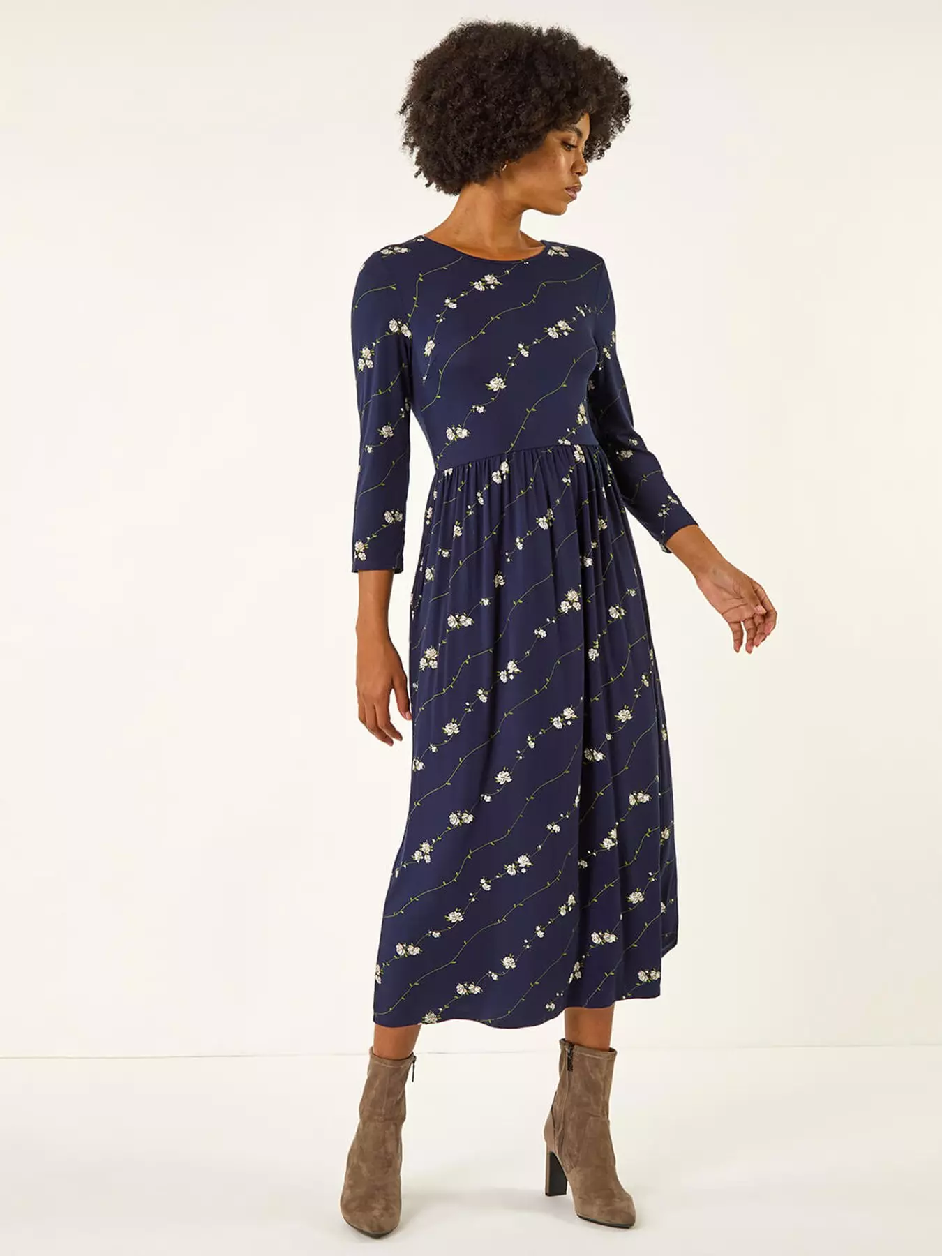 Make a stylish statement this Autumn/Winter in this pretty floral round neck midi dress. Designed with 3/4 sleeves and crafted from a soft stretchy jersey fabric this dress offers both comfort and style. The flattering gathers at the waist create a chic silhouette while side pockets add a practical touch. Pair with tights and ankle boots for a versatile and on-trend look that will take you from day to night effortlessly!- Material Content: 96% Viscose 4% Elastane
