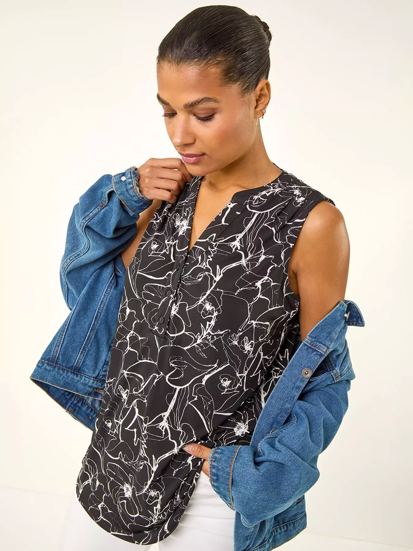 Stay cool and stylish this Spring/Summer in our floral print vest. Crafted from stretchy jersey fabric this sleeveless top features a unique gather detail at the shoulders adding a touch of sophistication to your outfit. Finished at the hip length with delicate button details this vest is perfect for pairing with jeans and trainers for a chic and casual look that will take you from day to night effortlessly!- Material Content: 95% Polyester 5% Elastane