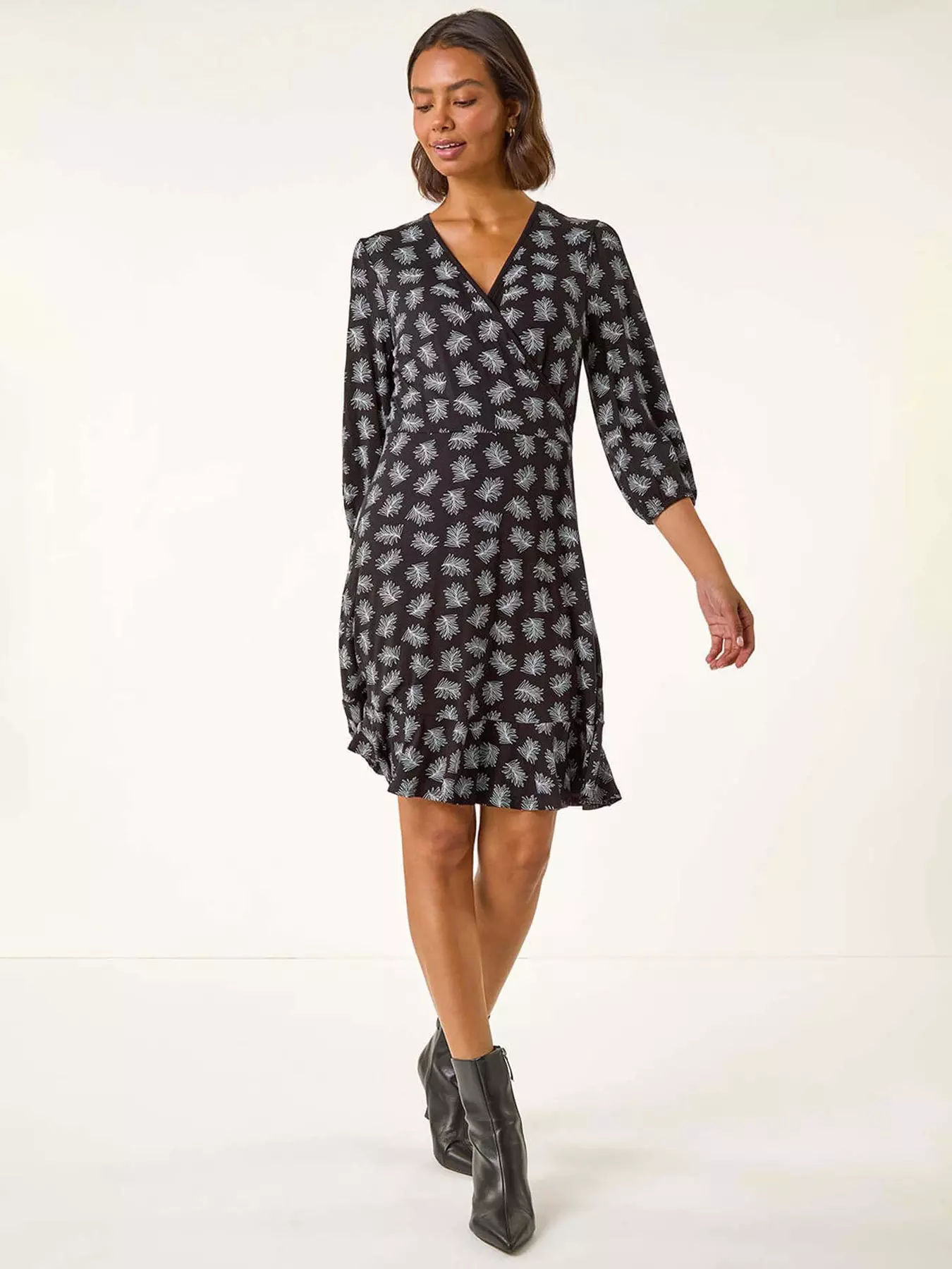 Feel fabulous in this charming leaf print wrap dress perfect for the Autumn/Winter season. The V-neck and 3/4 sleeves with elasticated cuffs add a touch of elegance to this fit and flare style dress. Complete with a frill detail at the hem this knee-length dress is ideal for both casual and dressy occasions. Pair it with tights and ankle boots for a chic and stylish ensemble that will take you from day to night effortlessly!- Material Content: 96% Viscose 4% Elastane