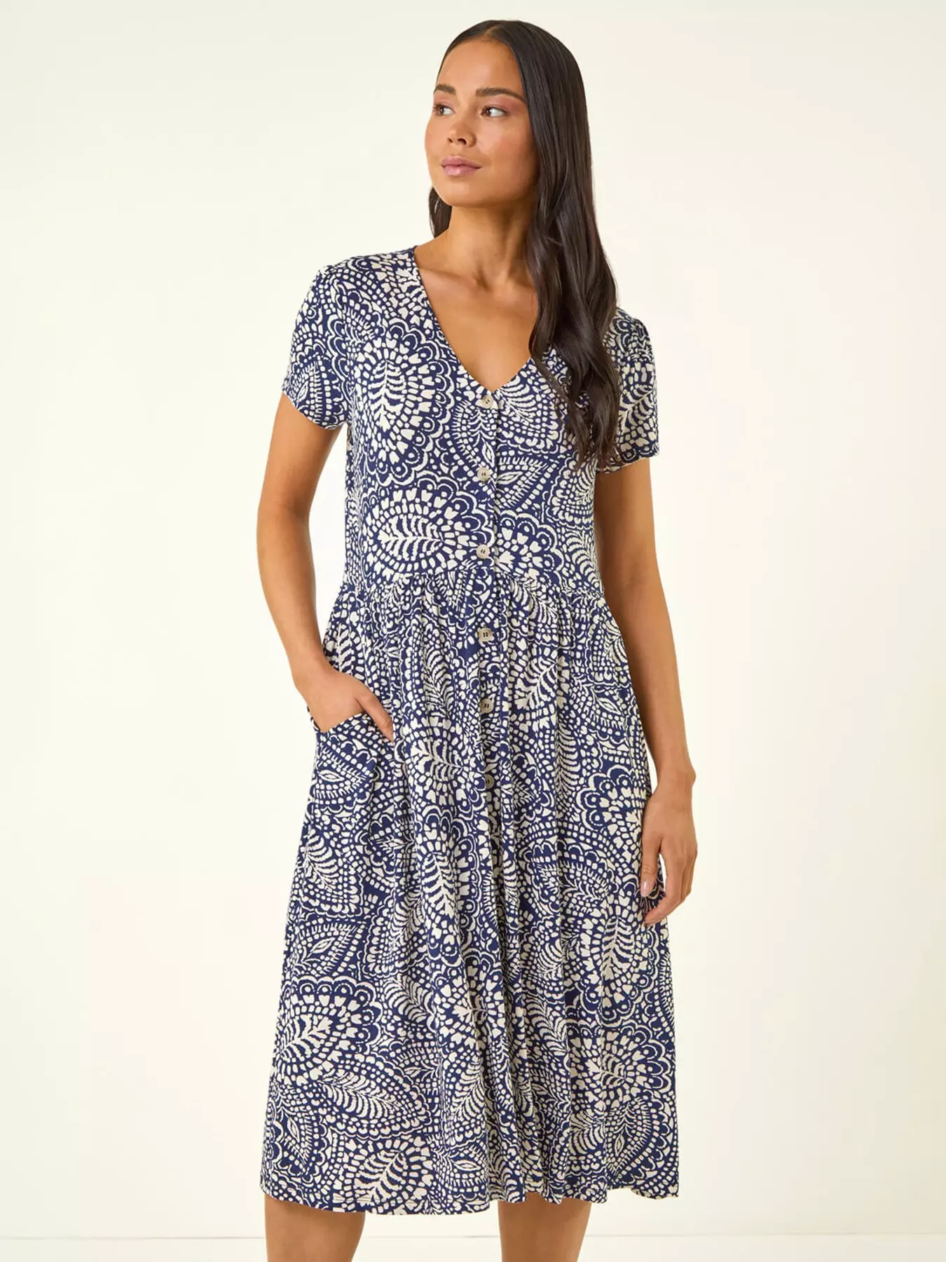 Prepare to stand out this Spring Summer in this chic Petite abstract print dress. The v-neckline and short sleeves with a unique button-through detail give it an interesting twist finishing elegantly at knee length. Cut from a comfortable stretch jersey fabric with an abstract print this dress offers both style and comfort. The essential side pockets add functionality and style making it a perfect choice for any occasion. Pair with a denim jacket and wedged heels!- Material Content: 96% Viscose 4% Elastane
