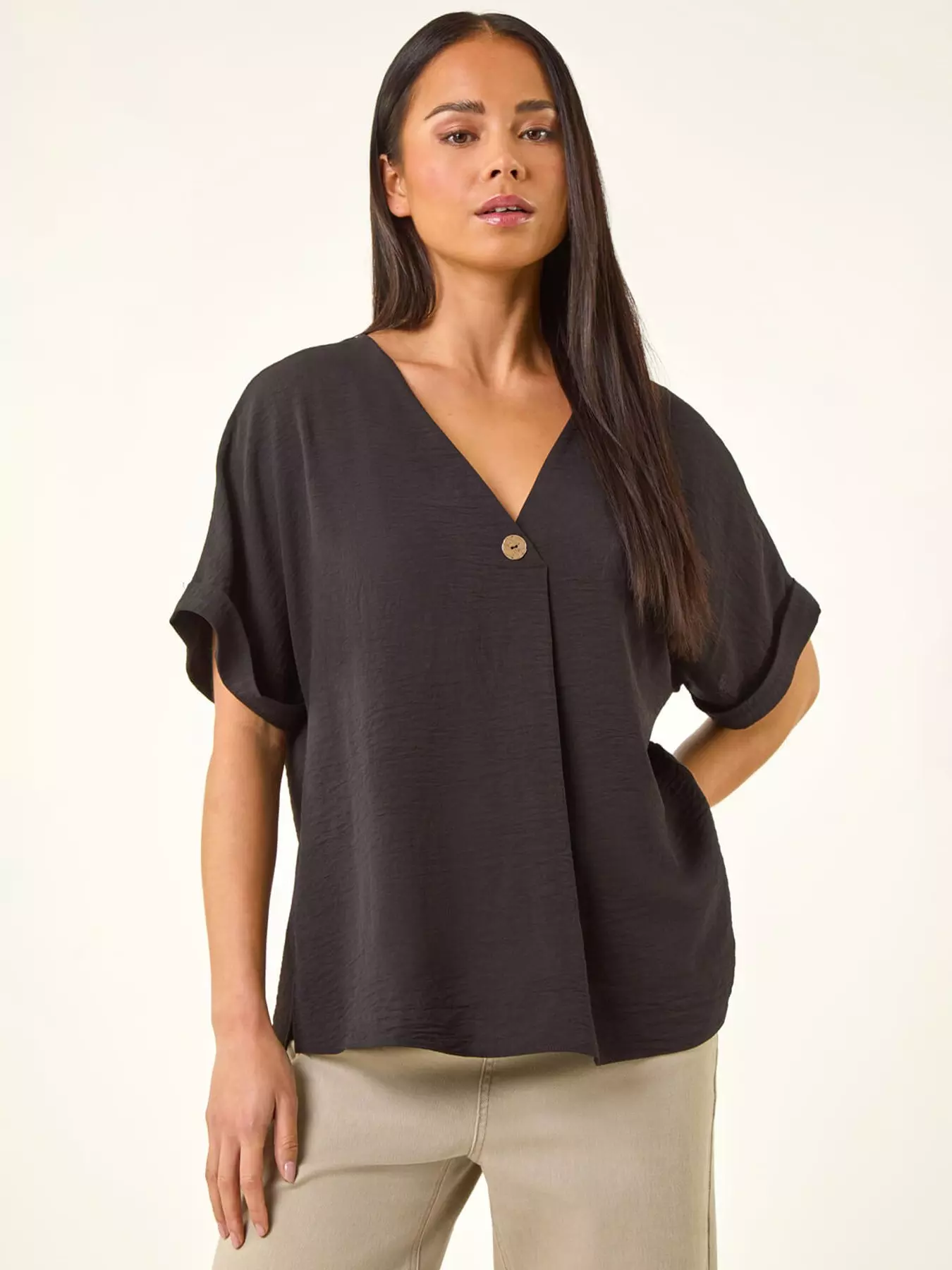 This stylish top finishes at the hips with a flattering V-neck and a single button detail. It features short set-in sleeves with a trendy turn over cuff and is made from a comfortable woven fabric. The pull on style offers easy wearability making it perfect for everyday casual outfits. Style it with jeans and sandals for a chic laid-back look.- Material Content: 100% Polyester