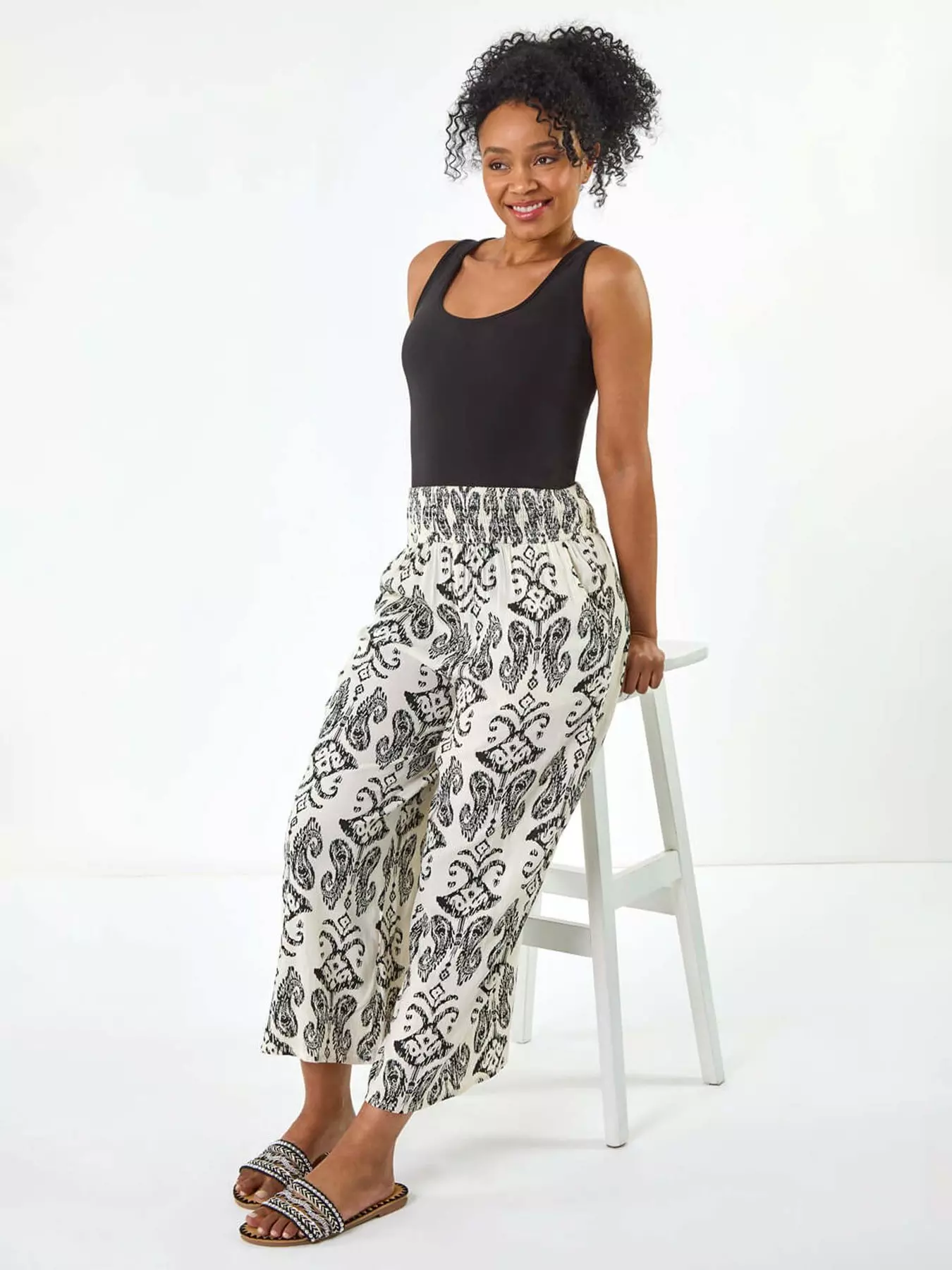 Get ready to step into Spring with these stylish Petite crop trousers. The wide waistband with shirred elastic ensures a comfortable fit while the stunning print adds a touch of flair to your look. Crafted from a comfortable woven fabric these trousers are perfect for pairing with a blouse and flats for a trendy outfit!- Material Content: 100% Viscose