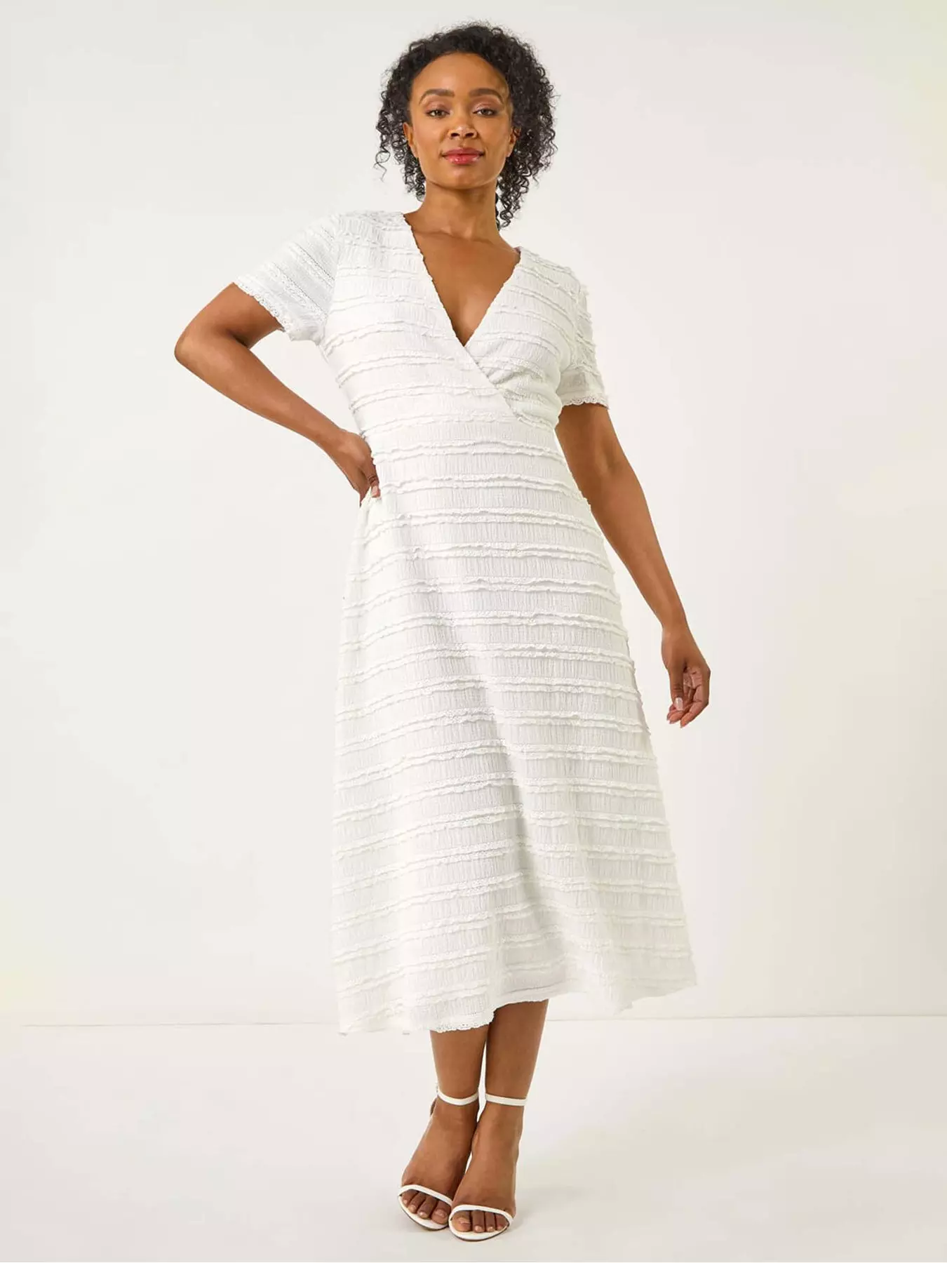 E.A.N: 5 0 6 3 5 6 6 2 8 4 2 5 8Roman Petite Ruffle Midi Wrap Dress - White