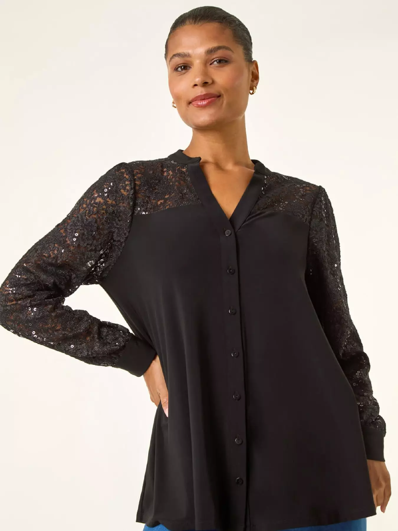 This party ready top features a flattering V-neckline and button through front crafted in soft plain ITY fabric across the placket cuffs and bodice for a smooth elegant feel. The standout detail is the contrast lace yoke adorned with subtle sequins adding a touch of sparkle and texture. Style effortlessly with pleather trousers and heeled boots for a chic evening look.- Material Content: 95% Polyester 5% Elastane Contrast Fabric: 60% Polyamide 38% Polyester 3% Elastane
