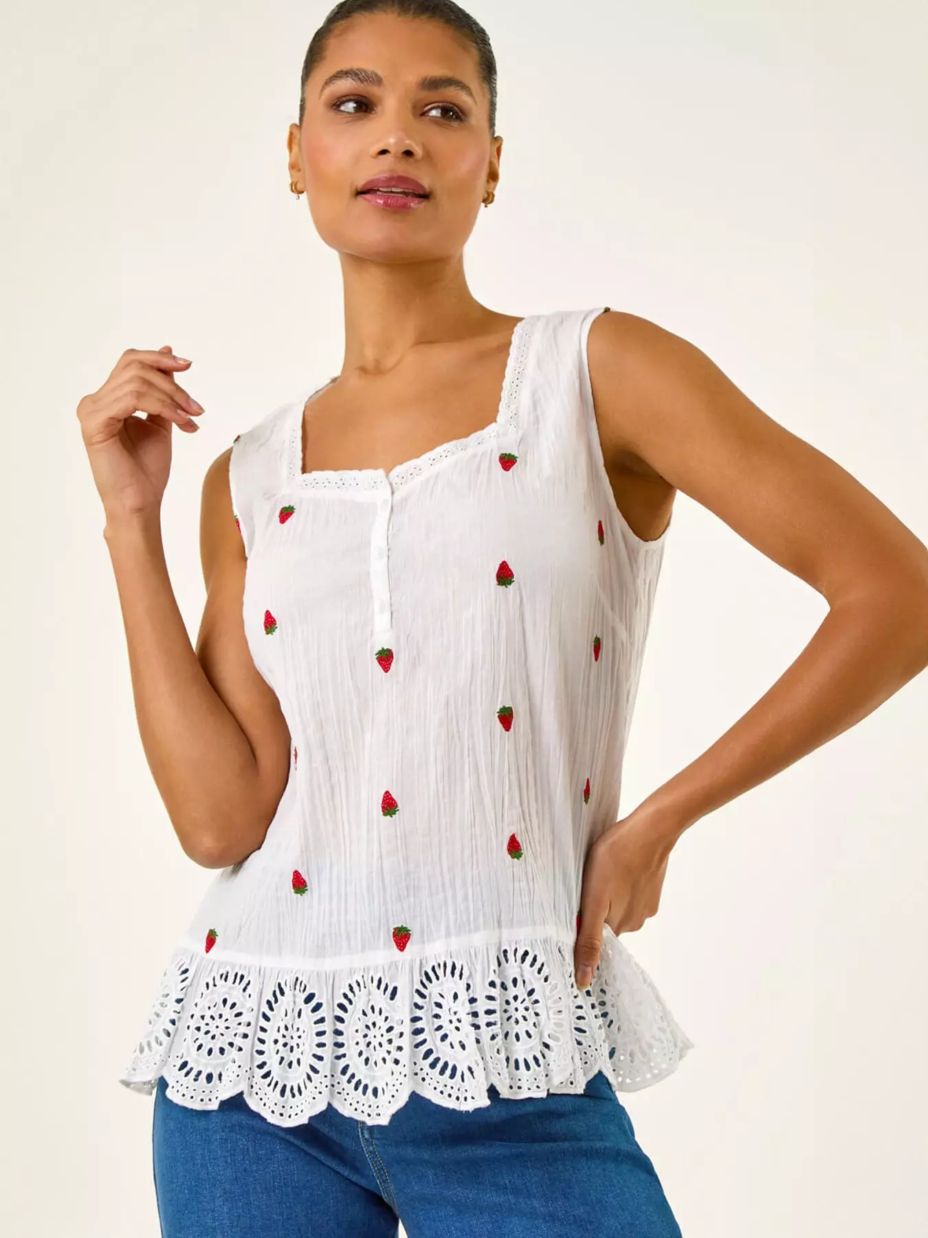 Give your summer wardrobe a sweet touch with this delightful embroidered top. The strawberry detail adds a playful charm to this vest. Cut from a soft cotton fabric this dress features a flattering square neck and trim detail for an extra special touch. Perfect for those warm days style it with a denim jacket and jeggings for a complete look that's sure to stand out!- Additions: Length: Approx. 66cm