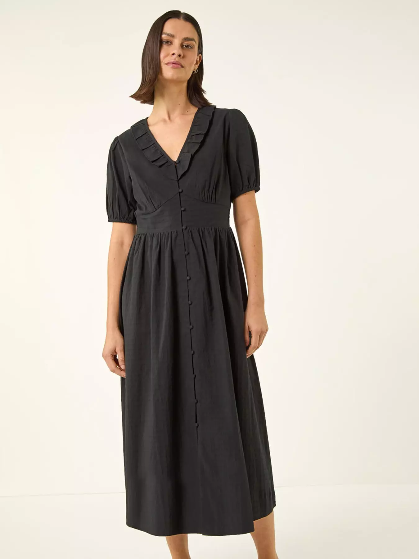 Get ready to make a stylish statement in this textured frill detail midi dress! Featuring a flattering V-neck and short puff sleeves with cute gathered cuffs this dress is perfect for Spring/Summer. Complete with button detailing and an elasticated waist in a flattering fit and flare shape. Pair this dress with sandals and a denim jacket for the ultimate chic and on-trend look!- Material Content: 100% Cotton