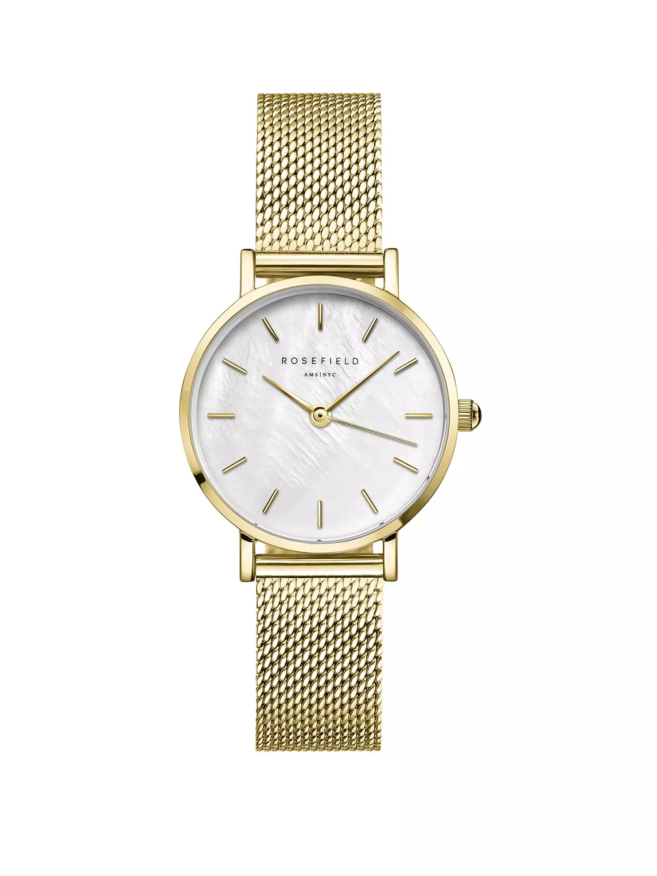 Rosefield SMALL EDIT ladies watch with stunning MOP dial all set in a gold IP stainless steel case and mesh bracelet.- 24Hr Display: N