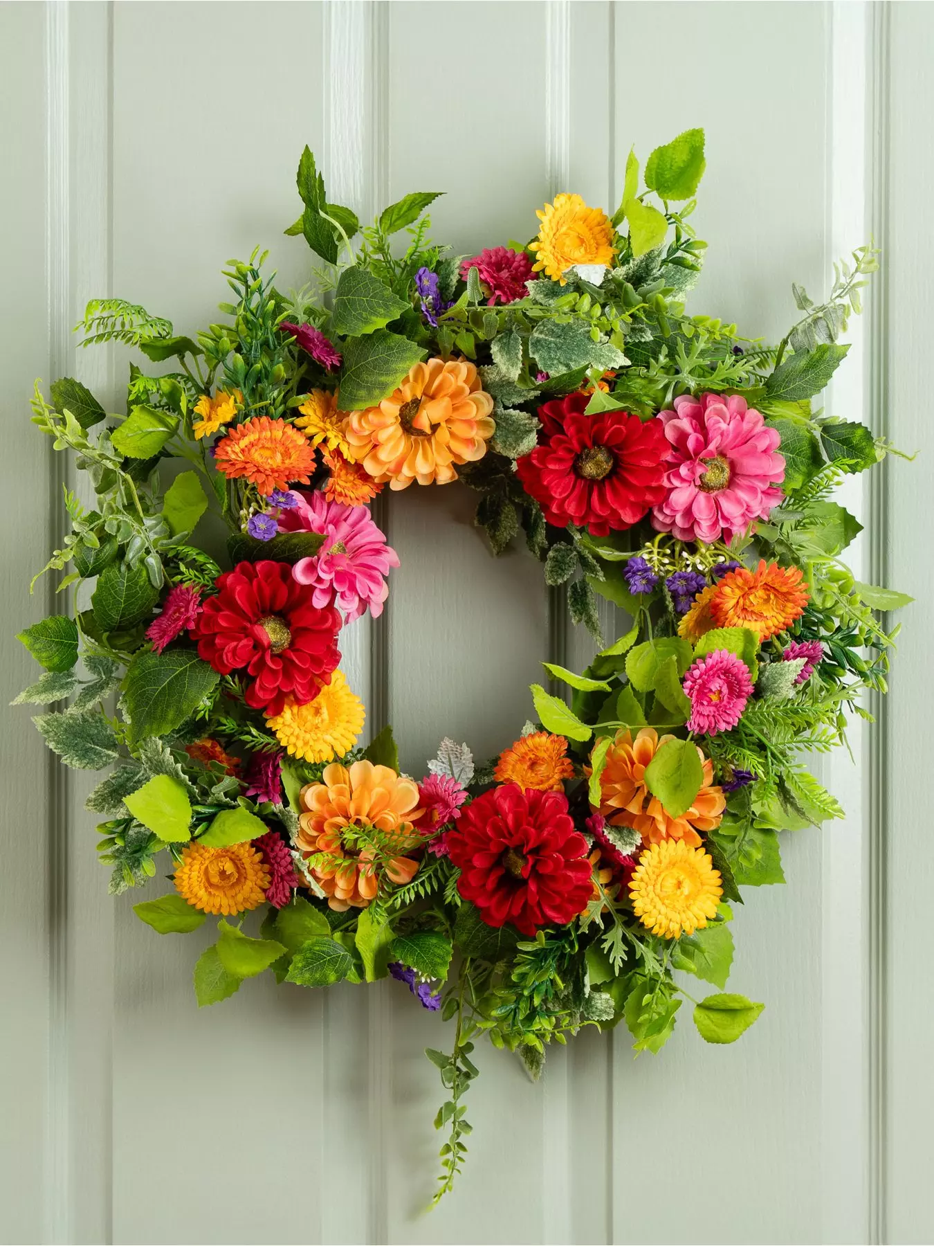 Bring a touch of nature's beauty into your home with this stunning artificial 60cm multi floral wreath. Bursting with a delightful mix of vibrant dahlias and marigolds in a range of colours, this wreath showcases a harmonious blend of florals that evoke the feeling of a blooming garden in full springtime splendour.Perfect for hanging on doors, windows, or as a statement piece on a wall, this wreath adds a burst of colour and freshness to any space. The lifelike flowers and rich greenery are carefully arranged to create a natural, effortless look, while the durable design ensures it stays beautiful for years to come-without any of the maintenance.