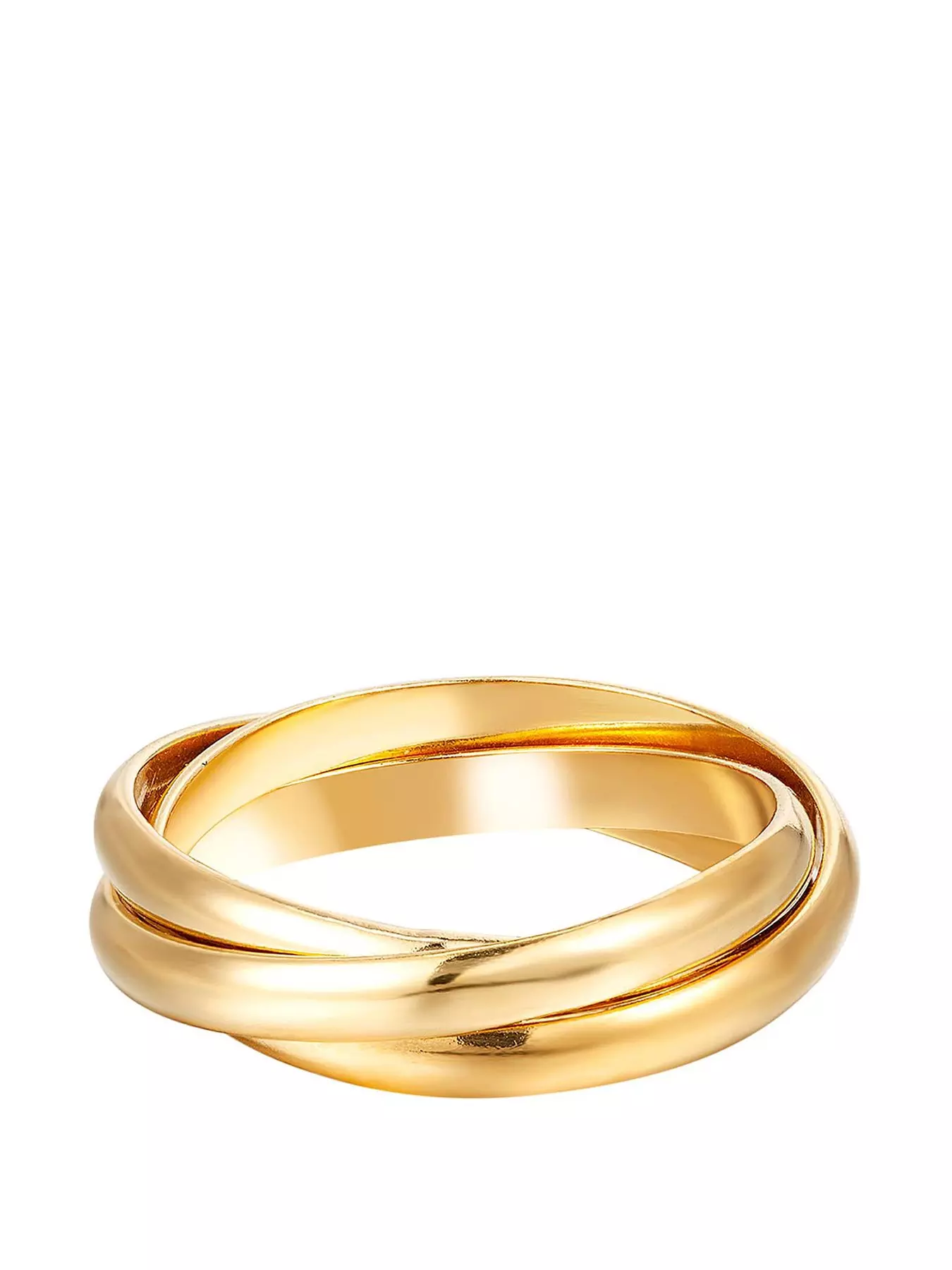 Trinity rolling ring with 3 interlocking bands. Available in 18ct yellow gold vermeil over sterling silver or sterling silver (.925). Bands measure 2.5mm. Ring is available in sizes J-R. Made using sterling silver (.925) and then plated in 18ct gold vermeil, this is the highest coverage of plating available which we then finish with a clear e-coating to add longevity to each piece. Gift ready with our branded cotton gift bag included.- Metal Type: Gold Plated Silver