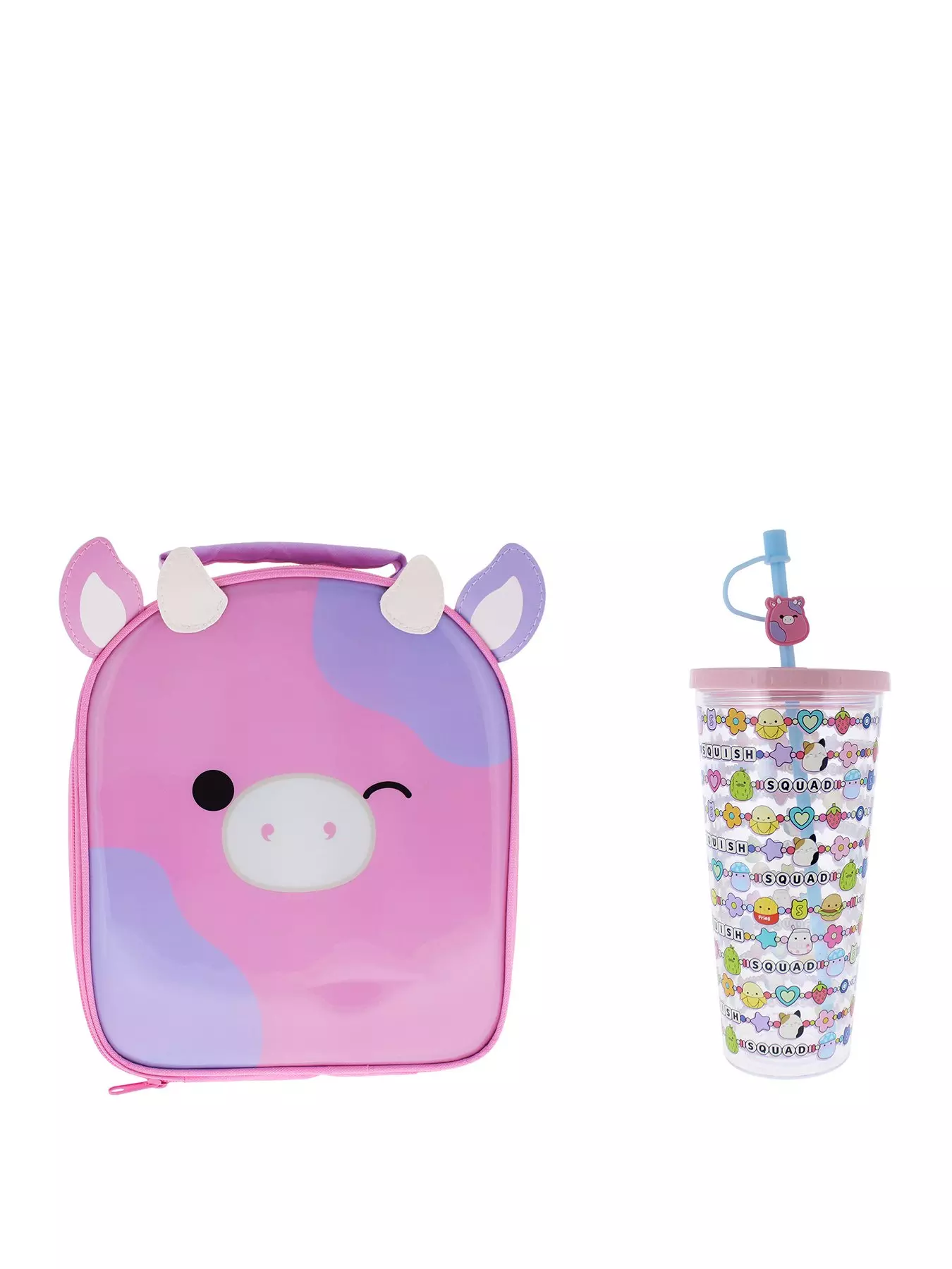 Keep your lunch fresh and cute with this Squishmallows insulated lunch bag, featuring a Patty-shaped PVC front, 3D ears and horns, a zip closure, carry handle, and a wipe-clean interior for easy maintenance.Stay hydrated in style with the Squishmallows beaker, featuring favourite characters, a clear base, pink lid, blue straw with cap, and a Patty-shaped MI clip for extra cuteness.