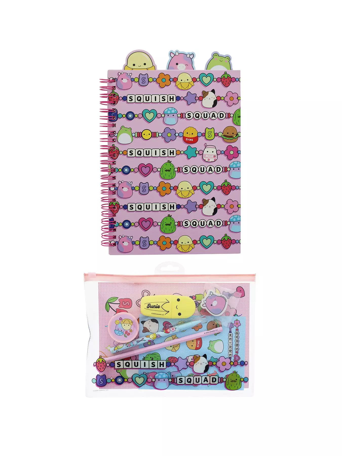 Stay organised and cute with this A5 wiro-bound Squishmallow notebook, featuring 160 lined pages divided into three sections, each with an adorable character-shaped divider. This set also includes an A5 exercise book, A6 sticker sheet, pen,pencil,eraser, sharpener, and highligher, all neatly stored in a zip -lock wallet.- Age Range: 6+