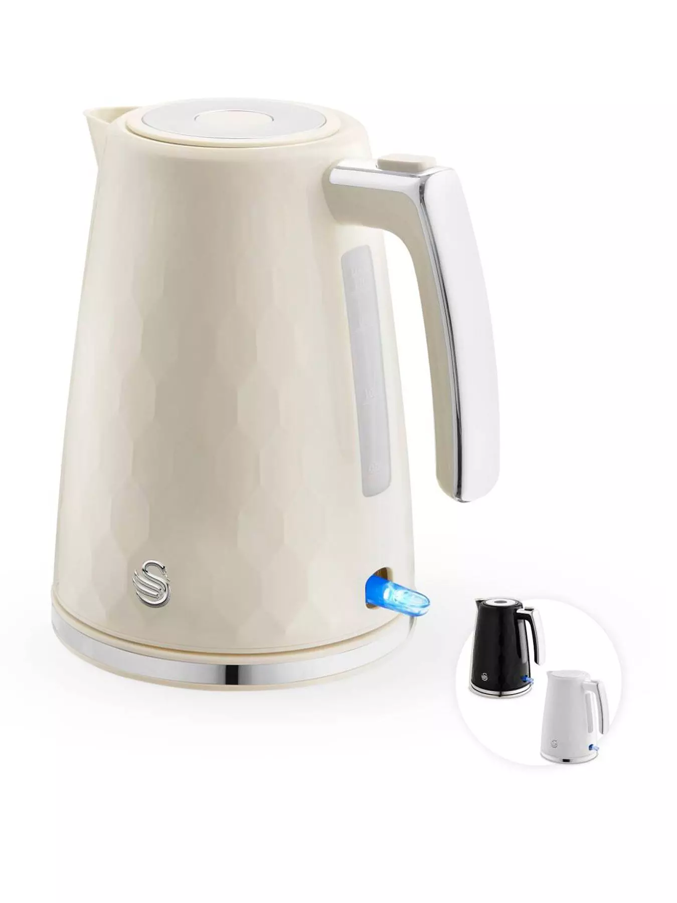Enhance your breakfast routine with the beautifully sculpted hexagonal pattern and chrome detailing on the Swan Hexton jug kettle. Featuring a large 1.7 litre capacity, you can make up to seven cups from one boil. This electric kettle features rapid boil technology, which boils water for one cup in just under 45 seconds, ready for a quick drink before heading out for the day. It also has a 360-degree rotating base for left or right handed users to safely pick up and pour with ease, along with a removable limescale filter to ensure your water tastes fresh for a delicious tea or coffee every time. This fast boil kettle also comes with built-in cord storage to keep your kitchen worktop neat and tidy. Part of the stylish new Swan Hexton collection, which includes a matching toaster (sold separately).