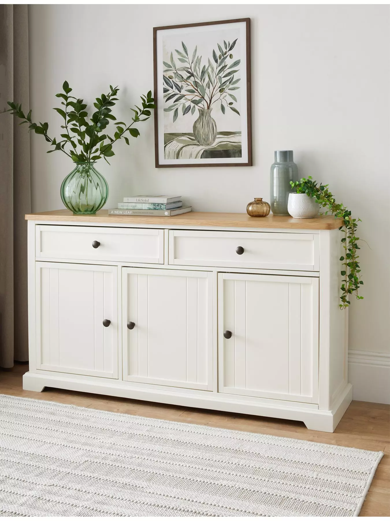 This sideboard from The Very Collection's Charlton range comes in a country cottage-inspired painted ivory shade, which is offset by a wonderfully grained oak-effect top. A two-door cupboard combines with a pair of drawers to offer lots of storage for everything from books to dinner party essentials, and it's accented with metal knob handles.Please remember to measure your available space before ordering.