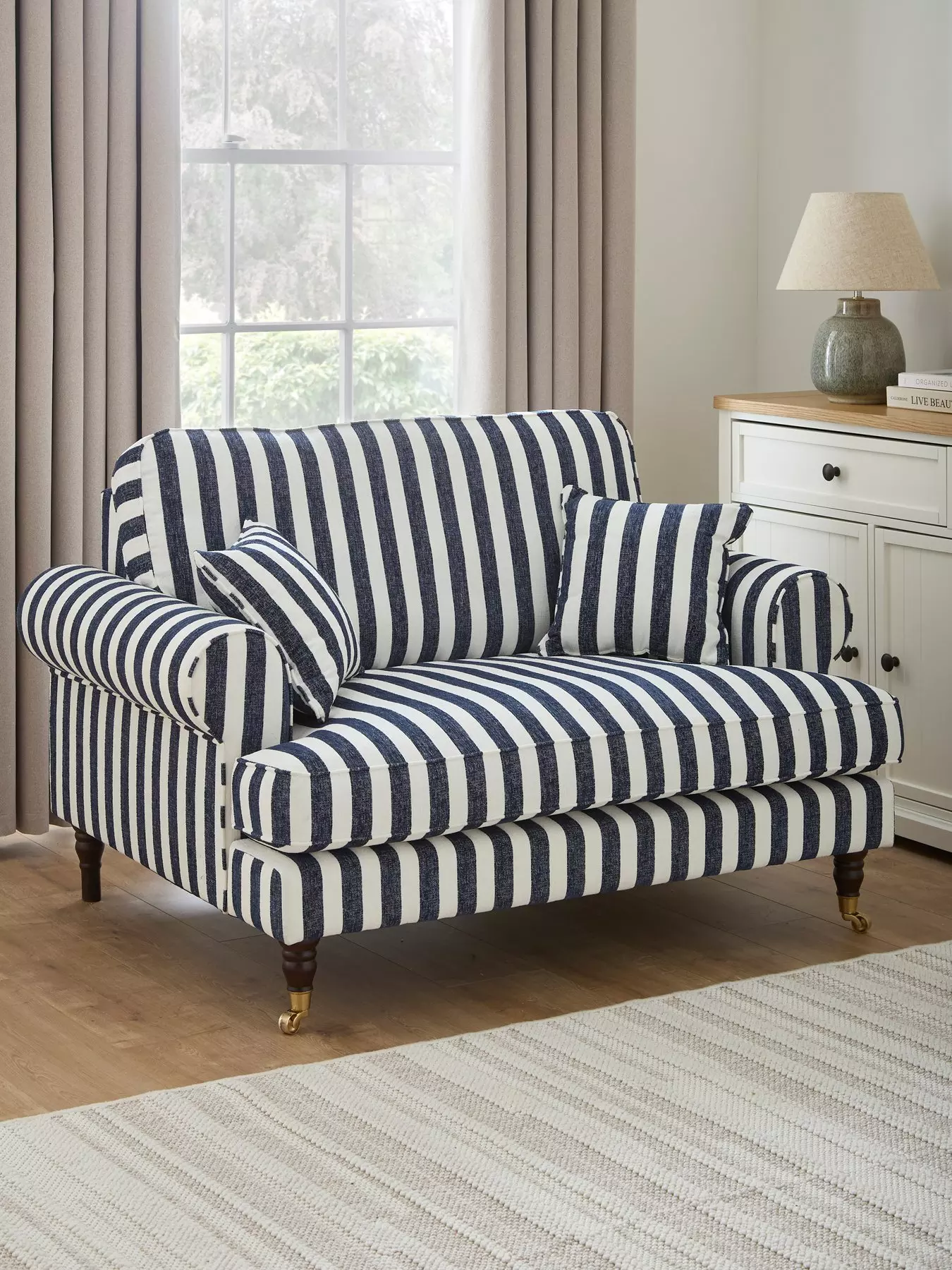 This breathtaking love chair from Very Home has a breezy seaside vibe that will instantly refresh your living space. Wrapped in a soft fabric, the key to its eye-catching design is the navy striped pattern that demands attention. It sits on wooden turned legs with gold-coloured castor feet, and comes complete with a pair of side cushions for added comfort.