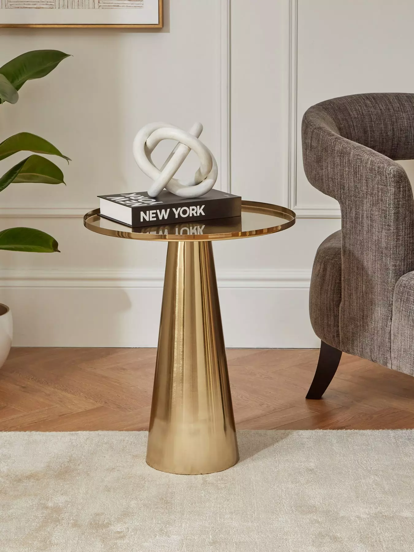 Striking in so many ways, this side table from The Very Collection's latest range is the perfect place to display your favourite lamp - just watch how stunning the furniture looks when the light shines down on it!Made from iron, it's finished in a breathtaking brushed gold for a sleek, rich appearance in your space. And to make it even more noticeable, the base has an eye-catching conical shape which rises up towards the 45 cm round top.