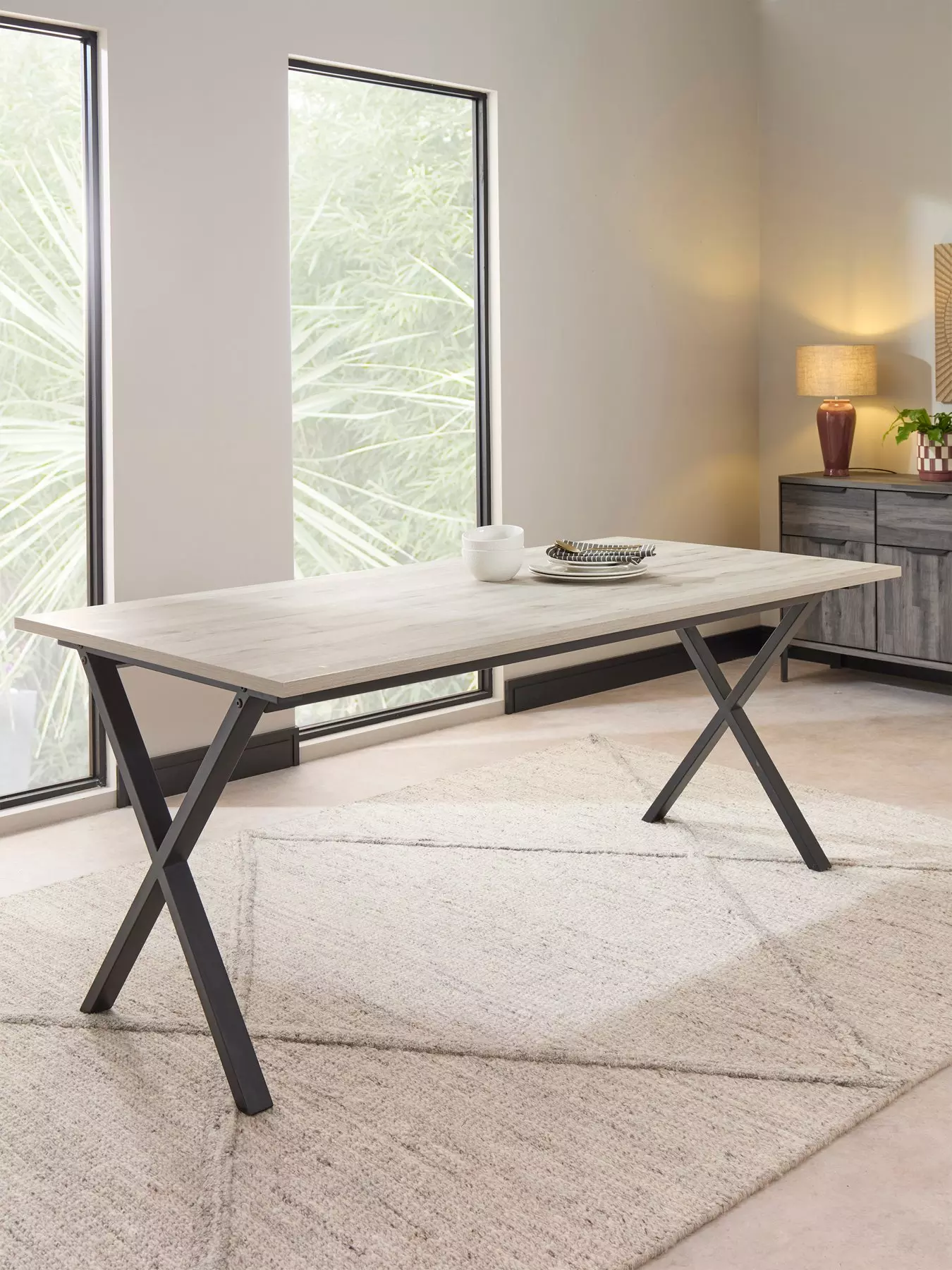 This bold dining table combines rustic style with the industrial trend, effortlessly blending a 180 cm grey oak-effect top with black metal legs. The legs feature an eye-catching criss-cross design which also ensures they have extra strength for superb support.Please remember to measure your available space before ordering.
