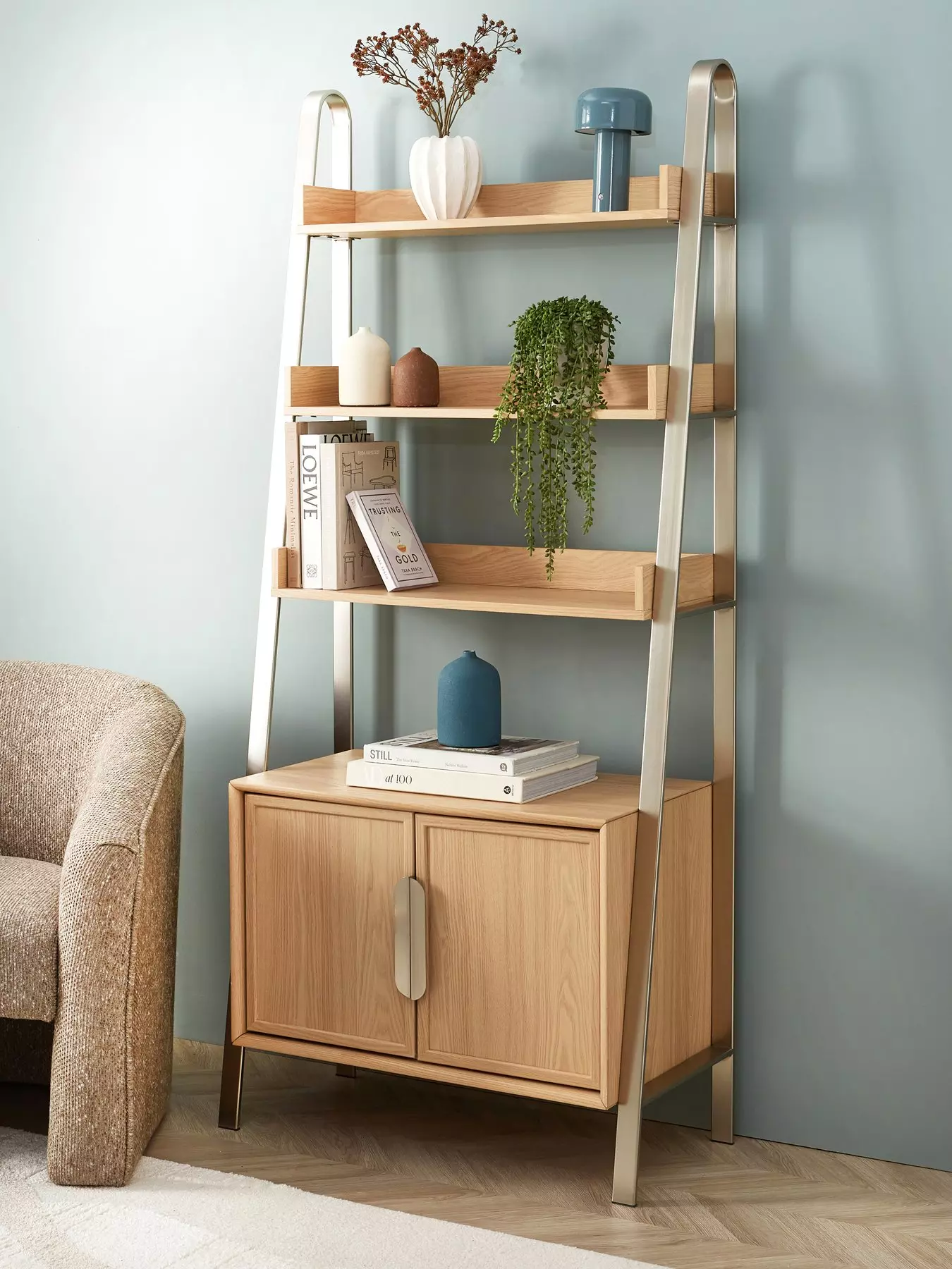 Store and display at the same time with this Lena bookcase. With 3 shelves for novels, ornaments and more, there's also a cupboard with additional shelving for stowing away clutter. The light oak-effect finish has a modern aesthetic, while metal V-shaped side sections provide support.Please remember to measure your available space before ordering.