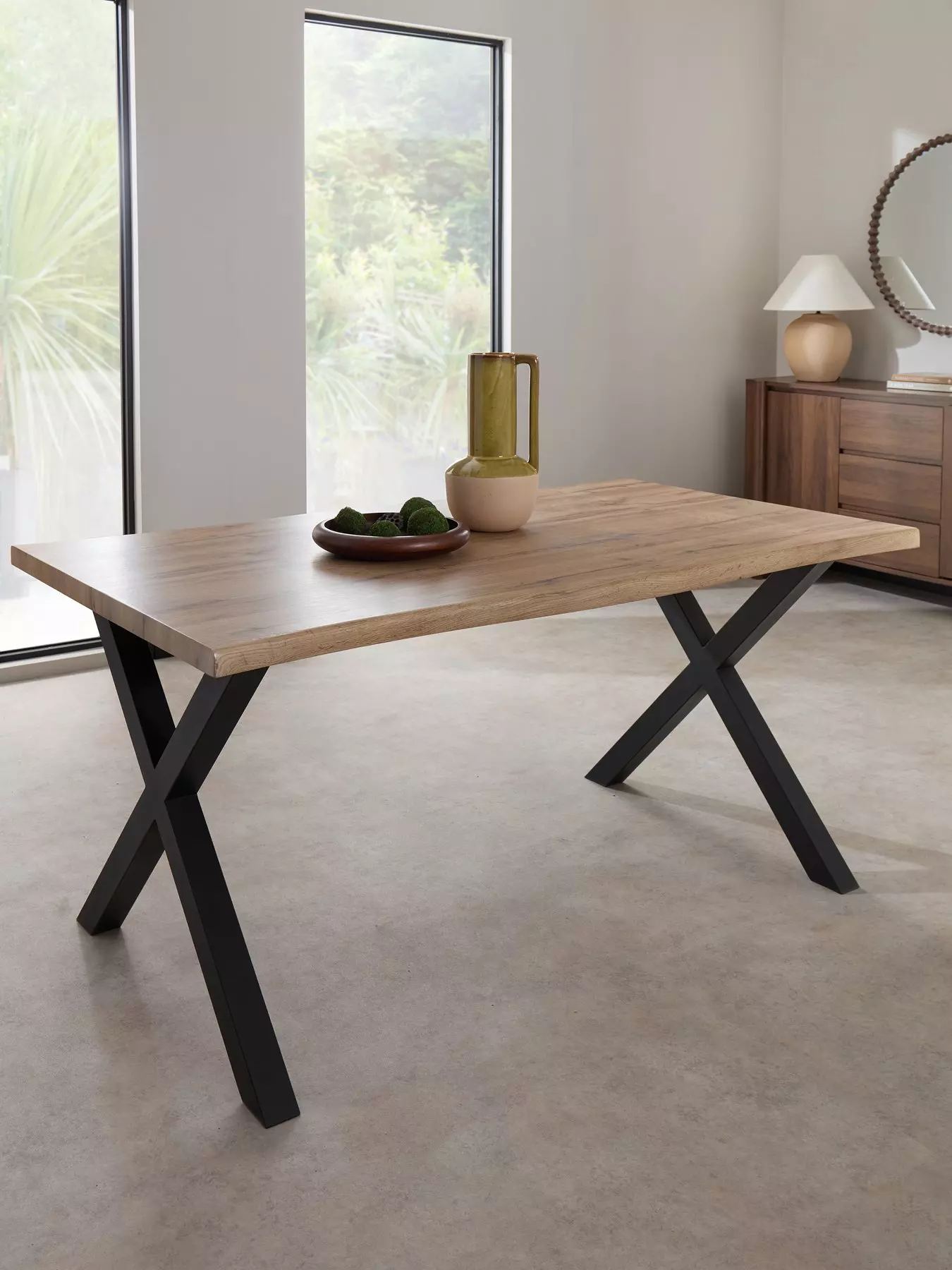 This contemporary dining table by The Very Collection features a 160 cm long table top in a realistic oak-effect. This is contrasted by black metal legs for an industrial edge, while the criss-cross design gives them extra eye-catching style.Dimensions: