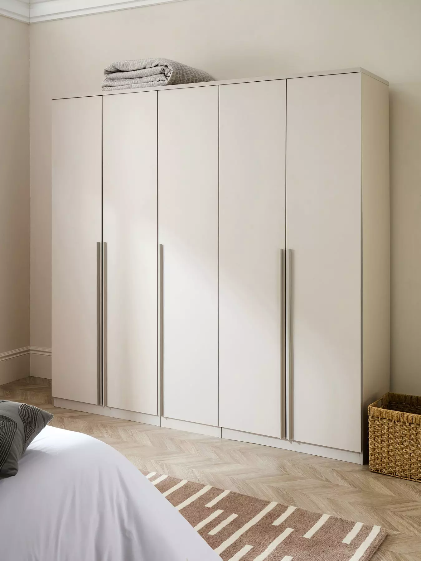 Stylish natural oatmeal coloured 5 door wardrobe. Each door is opened or closed via long slim easy-grip self coloured handles. The doors are held with large 6-way adjustable metal hinges. Internally 2 uprights support 3 large hanging rails, 1 large shelf and 3 smaller adjustable shelves.- Assembly: Self Assembly