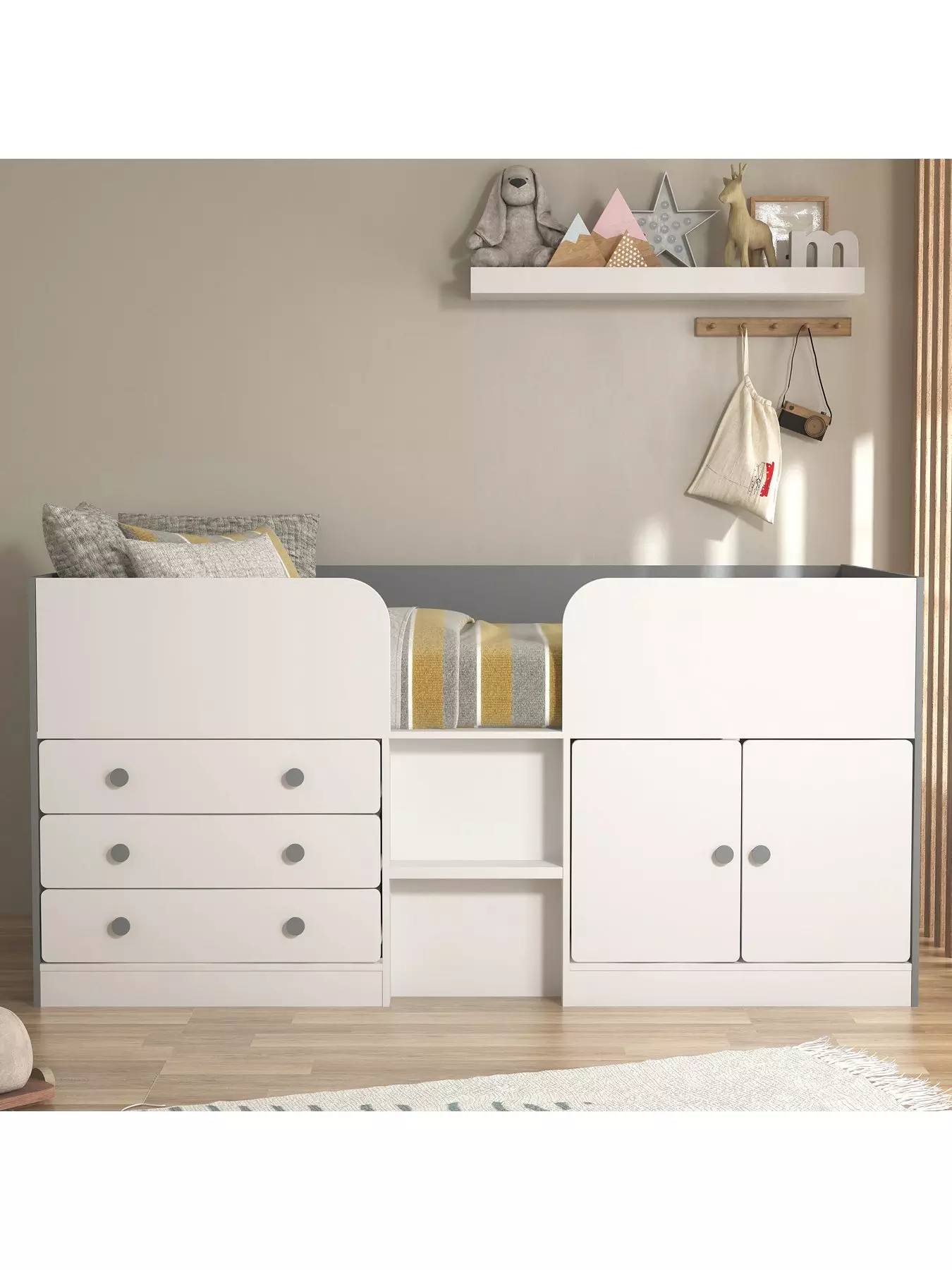 The Very CollectionPeyton Kids Mid Sleeper Bed with Drawers, Cupboard and Mattress Options (Buy and SAVE!) - White/Grey