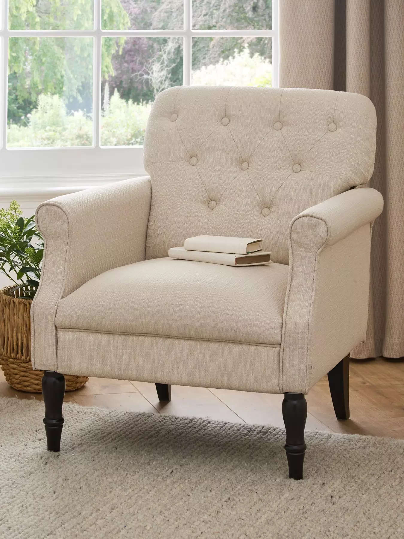 Wonderfully textural linen fabric comes in a choice of grey and ivory shades, while a classic design features rolled arms, button back detailing and elegant turned black legs. Perfect for placing in a corner or a lounge, bedroom or study to create a smart reading area, you can match it with an equally striking floor lamp. Fixed cushions are both filled with a combination of foam and fibre, offering both support and comfort.
