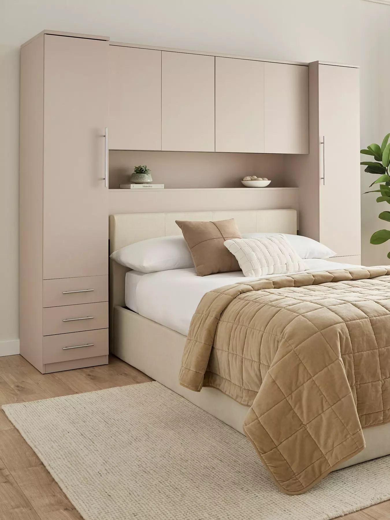 Make the most of the space around and above your bed with this overbed unit from our best-selling Prague collection. In a smooth oatmeal shade, the wardrobes contain a hanging rail for neat clothes storage, while three drawer bedside chests keep your nighttime essentials organised. The top section boasts cupboard space with shelving, and the whole thing is finished with designer metal bar handles, and the drawers open smoothly on easy-glide metal runners.Get the look with matching bedroom furniture in the Prague range.