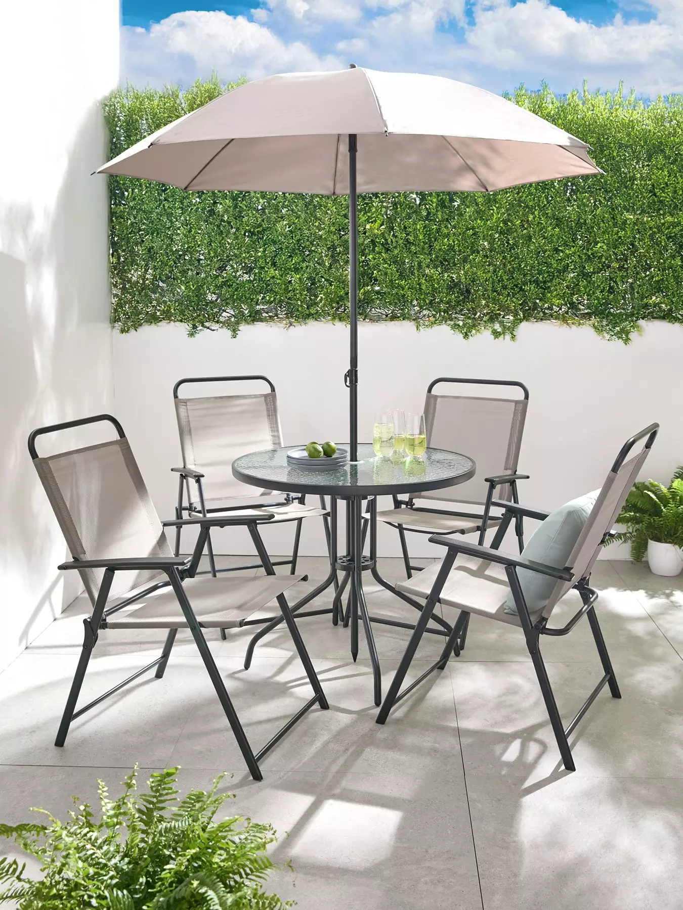 With 4 chairs and a table, there's plenty of room for your guests to enjoy some al fresco wining and dining all summer long. The included parasol is perfect for shielding you from the sun's glare and UV rays.- Style: Dining Set
